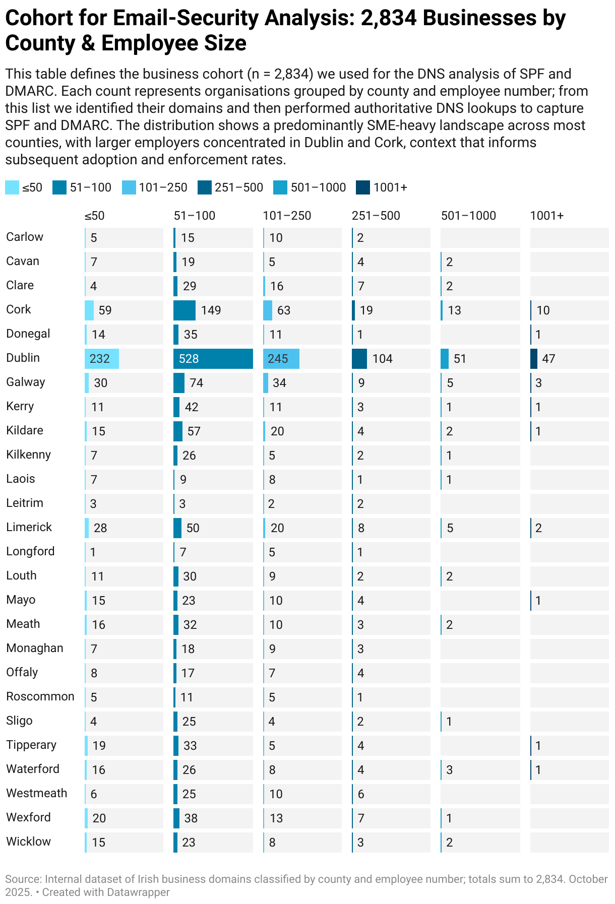 This table defines the business cohort (n = 2,834) we used for the DNS analysis of SPF and DMARC. Each count represents organisations grouped by county and employee number; from this list we identified their domains and then performed authoritative DNS lookups to capture SPF and DMARC. The distribution shows a predominantly SME-heavy landscape across most counties, with larger employers concentrated in Dublin and Cork, context that informs subsequent adoption and enforcement rates.