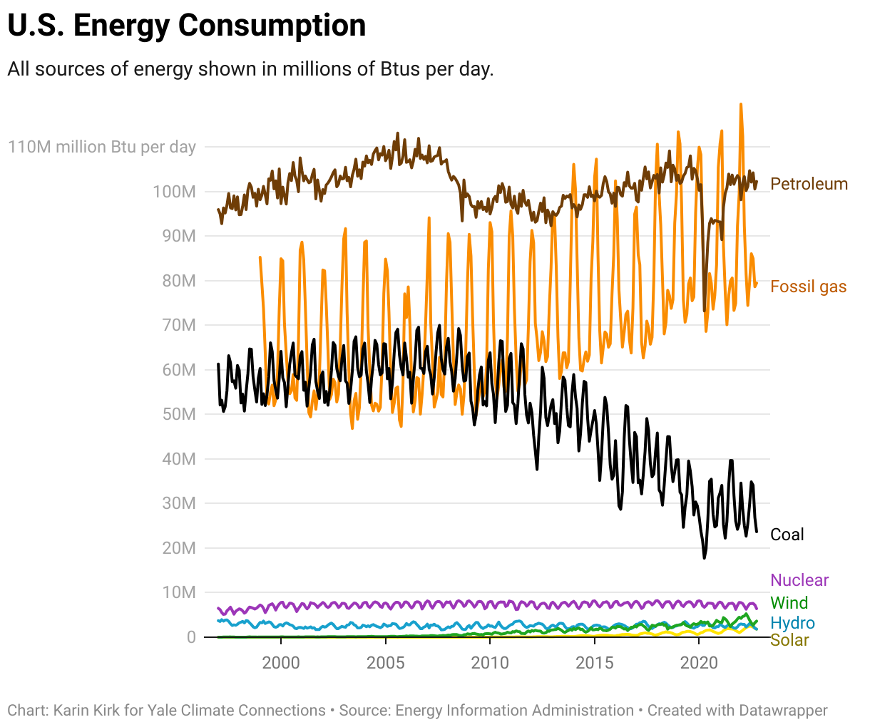 This chart shows 7 different sources of energy from 1997 through 2022. Each line shows how much of that source of energy has been consumed, and the data is plotted for every month.