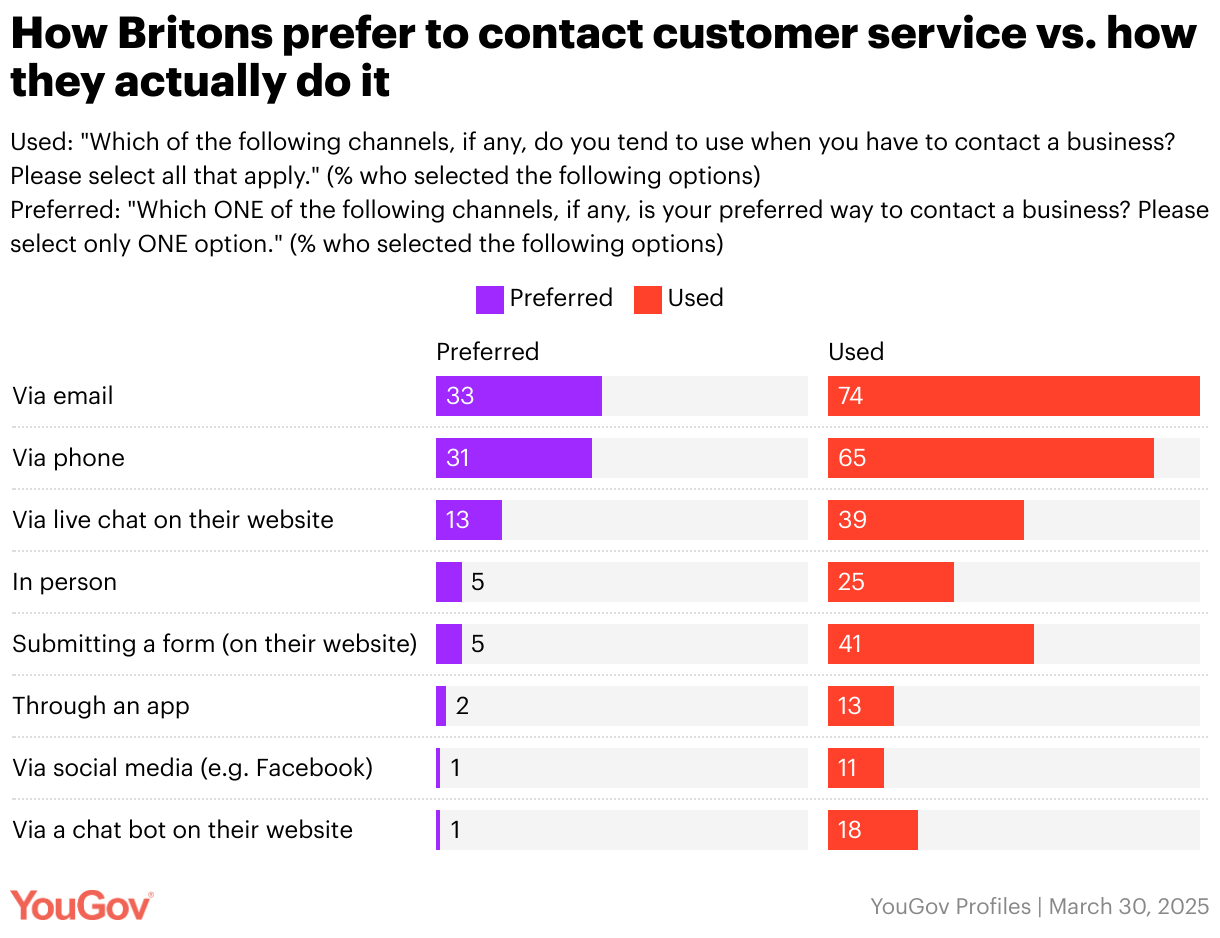 Preferred: "Which ONE of the following channels, if any, is your preferred way to contact a business? Please select only ONE option." (% who selected the following options)