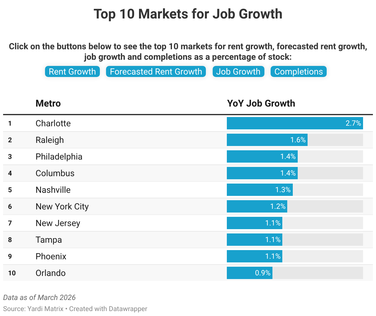 Click on the buttons below to see the top 10 markets for rent growth, forecasted rent growth, job growth and completions as a percentage of stock: