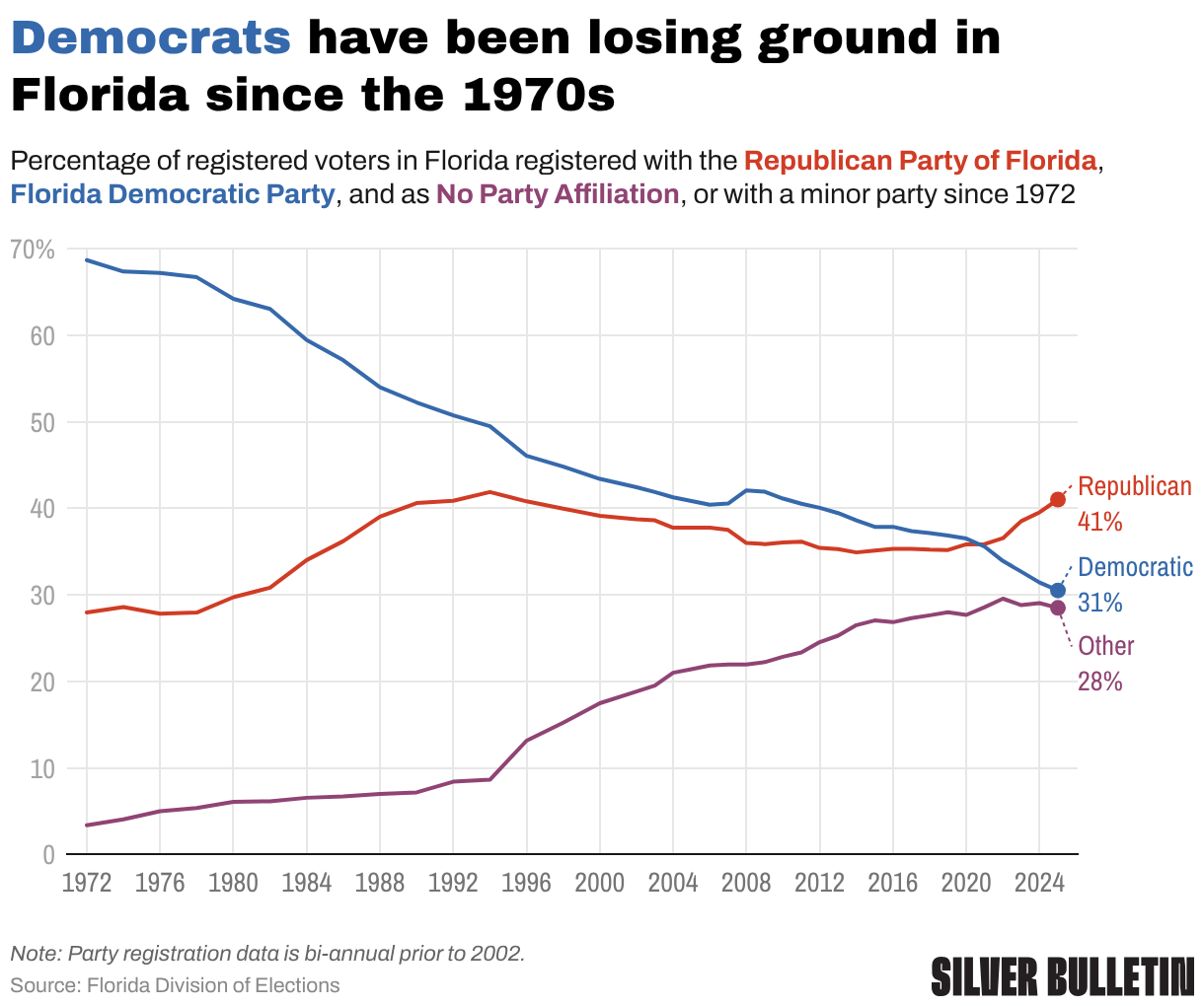 Percentage of registered voters in Florida registered with the Republican Party of Florida, Florida Democratic Party, and as No Party Affiliation, or with a minor party since 1972