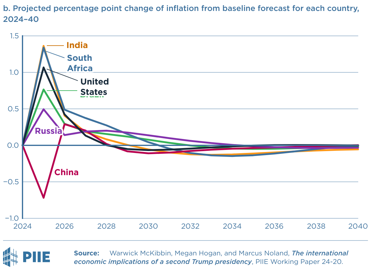 b. Projected percentage point change of inflation from baseline forecast for each country, 2024–40