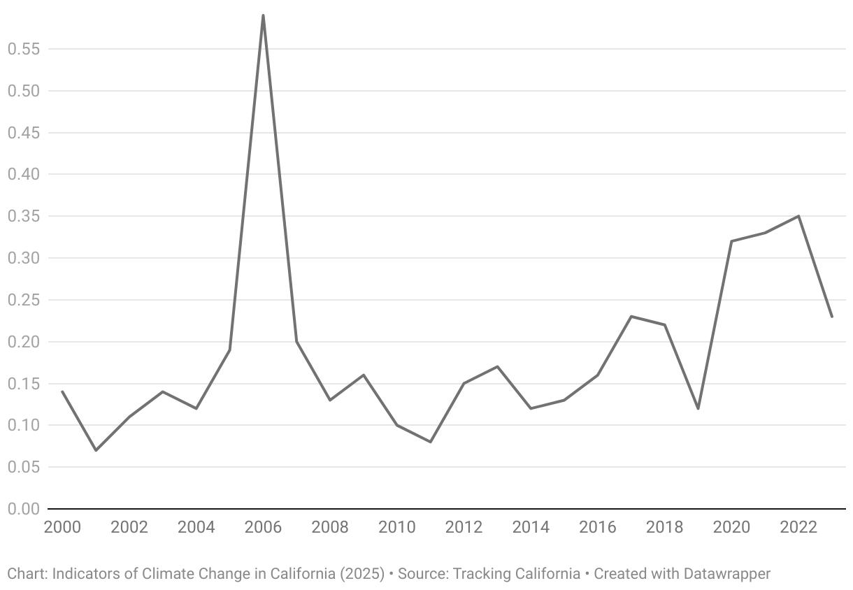 This graph shows deaths for which the main or contributing cause is coded as heat-related. The period covered is from May to September of each year. Rates were highest in 2006 when there was a prolonged heat wave.