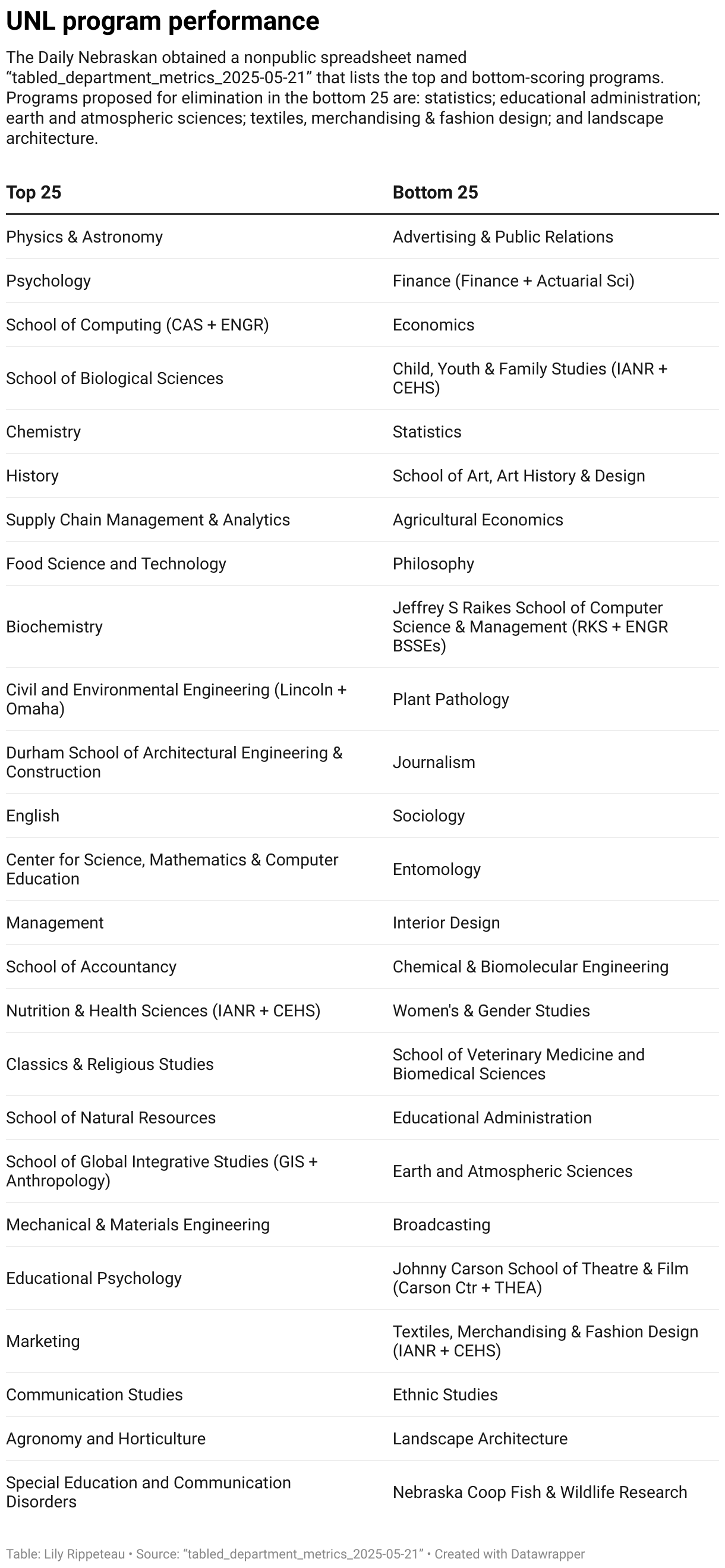 The Daily Nebraskan obtained a nonpublic spreadsheet named “tabled_department_metrics_2025-05-21” that lists the top and bottom-scoring programs. Programs proposed for elimination in the bottom 25 are: statistics; educational administration; earth and atmospheric sciences; textiles, merchandising & fashion design; and landscape architecture.