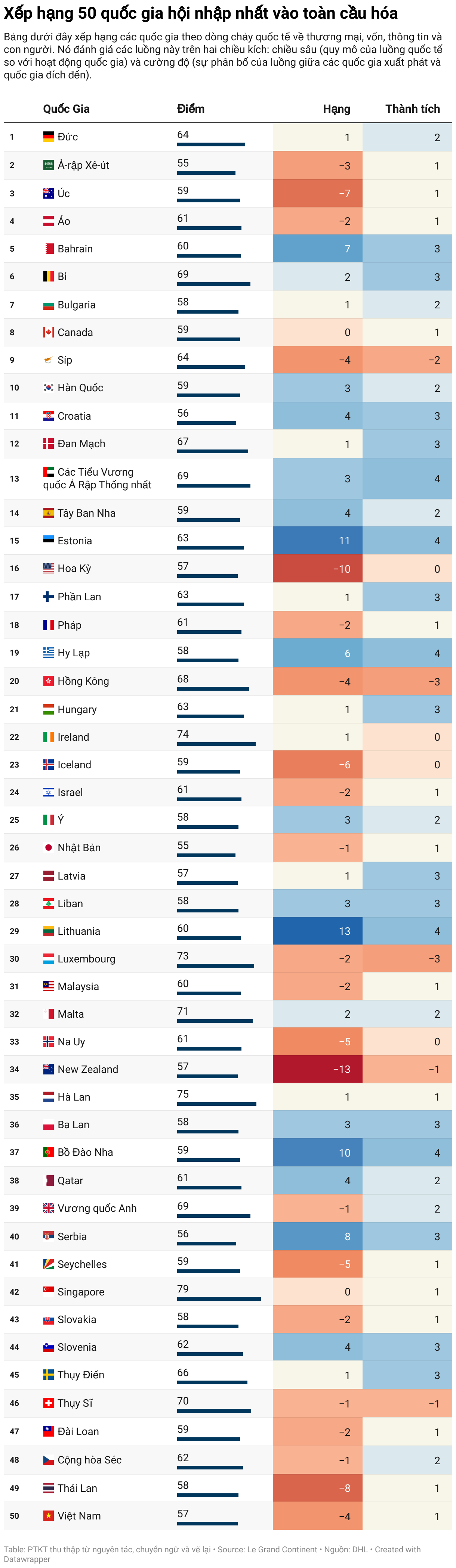 Bảng dưới đây xếp hạng các quốc gia theo dòng chảy quốc tế về thương mại, vốn, thông tin và con người. Nó đánh giá các luồng này trên hai chiều kích: chiều sâu (quy mô của luồng quốc tế so với hoạt động quốc gia) và cường độ (sự phân bố của luồng giữa các quốc gia xuất phát và quốc gia đích đến).
