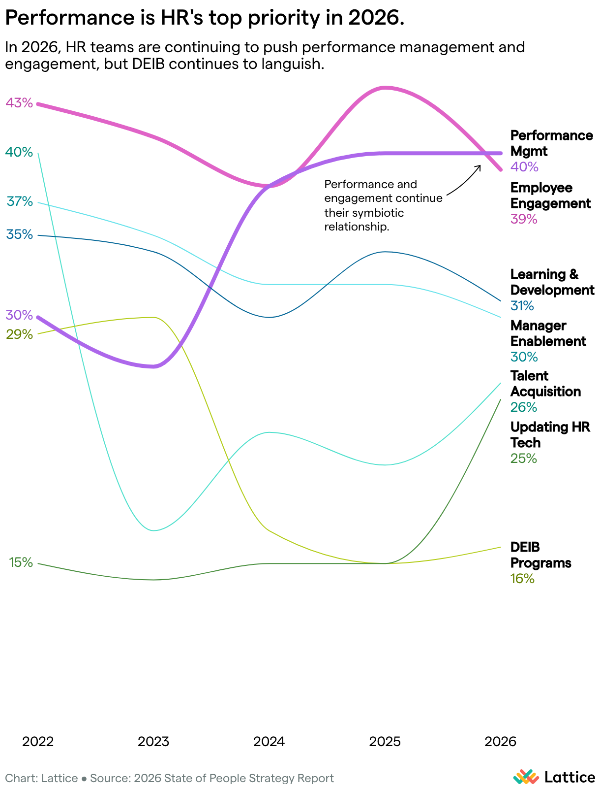 Line chart titled “Performance is HR’s top priority in 2026.” Performance management (40%) and employee engagement (39%) lead priorities. Learning & development (31%), manager enablement (30%), talent acquisition (26%), and updating HR tech (25%) follow. DEIB programs (16%) have declined steadily since 2023, while performance rose sharply over the same period. Key insight: Since 2023, performance and DEIB have moved in opposite directions, with performance climbing and DEIB deprioritized.