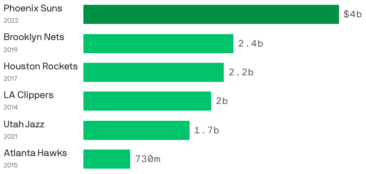 Bar chart showing how much six NBA franchises were bought for. The Phoenix Suns cost the most, at $4 billion in 2022. The Brooklyn Nets were second, at $2.4 billion in 2019. The Atlanta Hawks were the least out of the six, at $730 million in 2015.