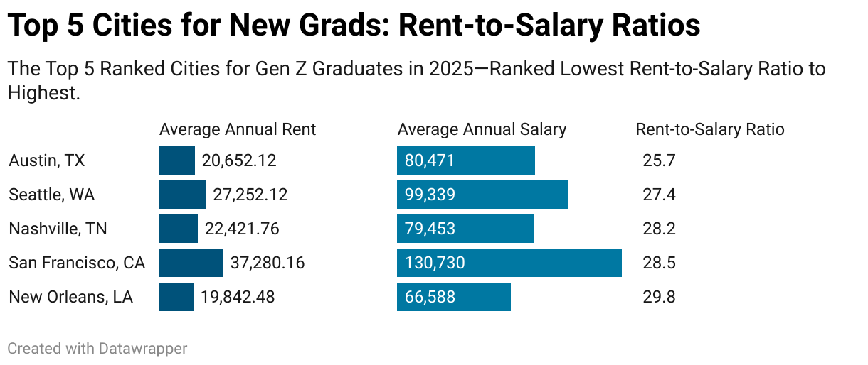 The Top 5 Ranked Cities for Gen Z Graduates in 2025—Ranked Lowest Rent-to-Salary Ratio to Highest.