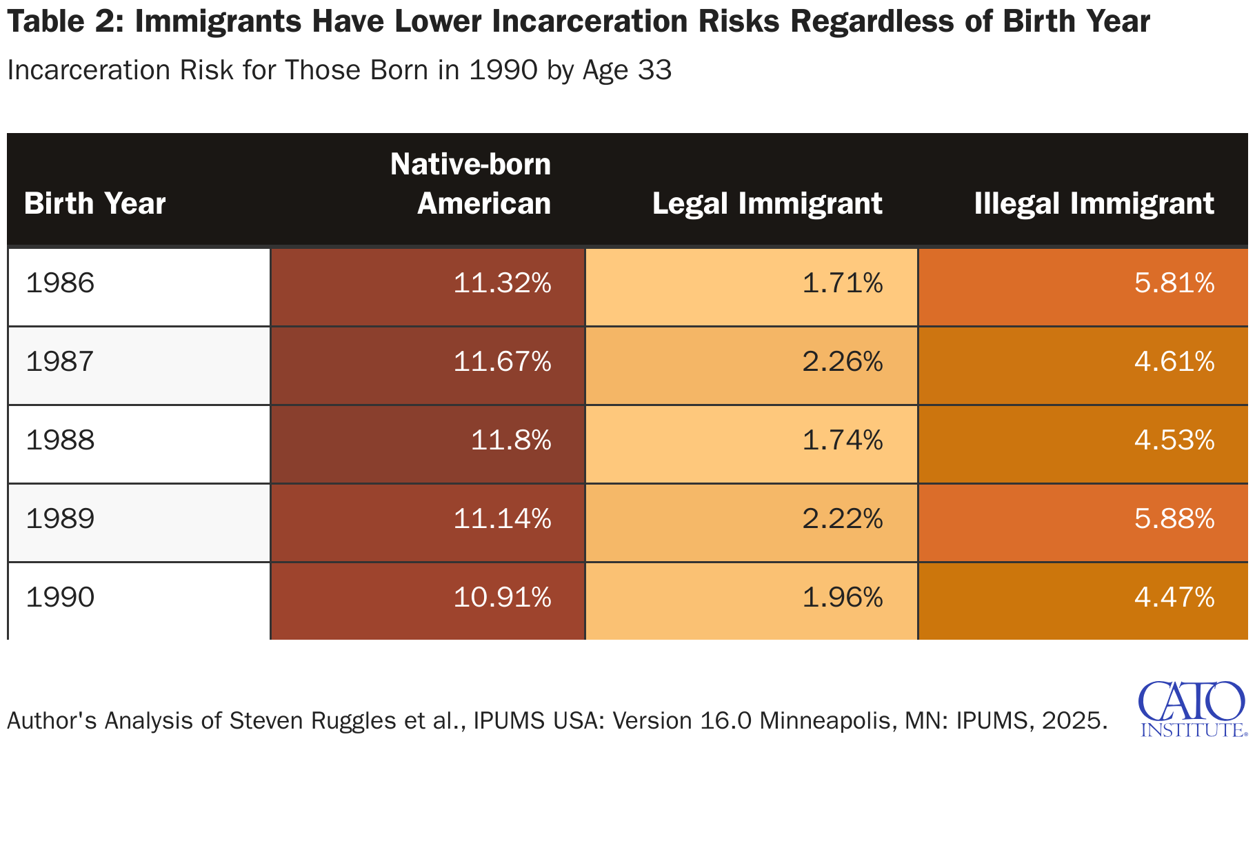 Table 2: Immigrants Have Lower Incarceration Risks Regardless of Birth Year