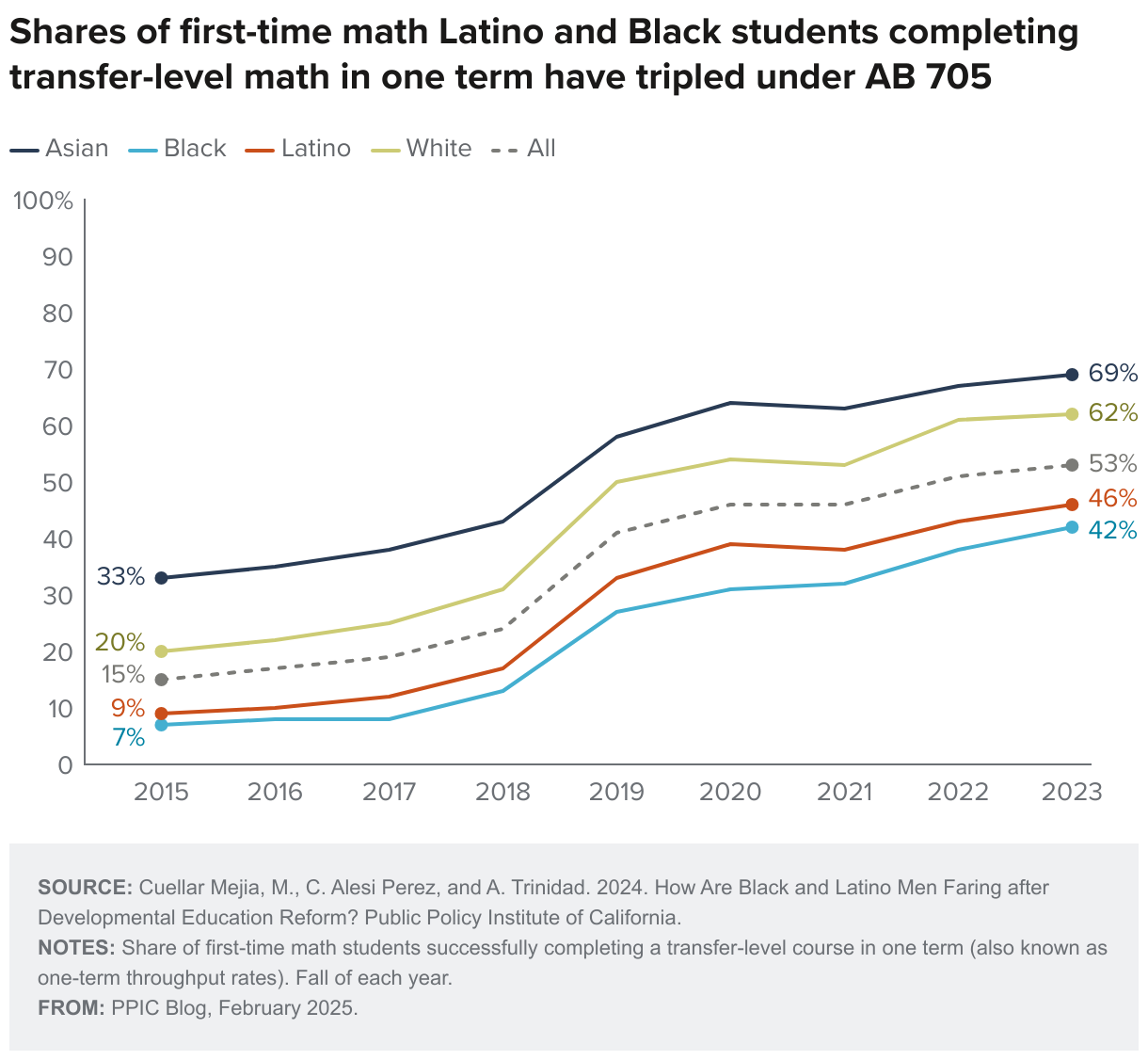 Shares of first-time math Latino and Black students completing transfer-level math in one term have tripled under AB 705