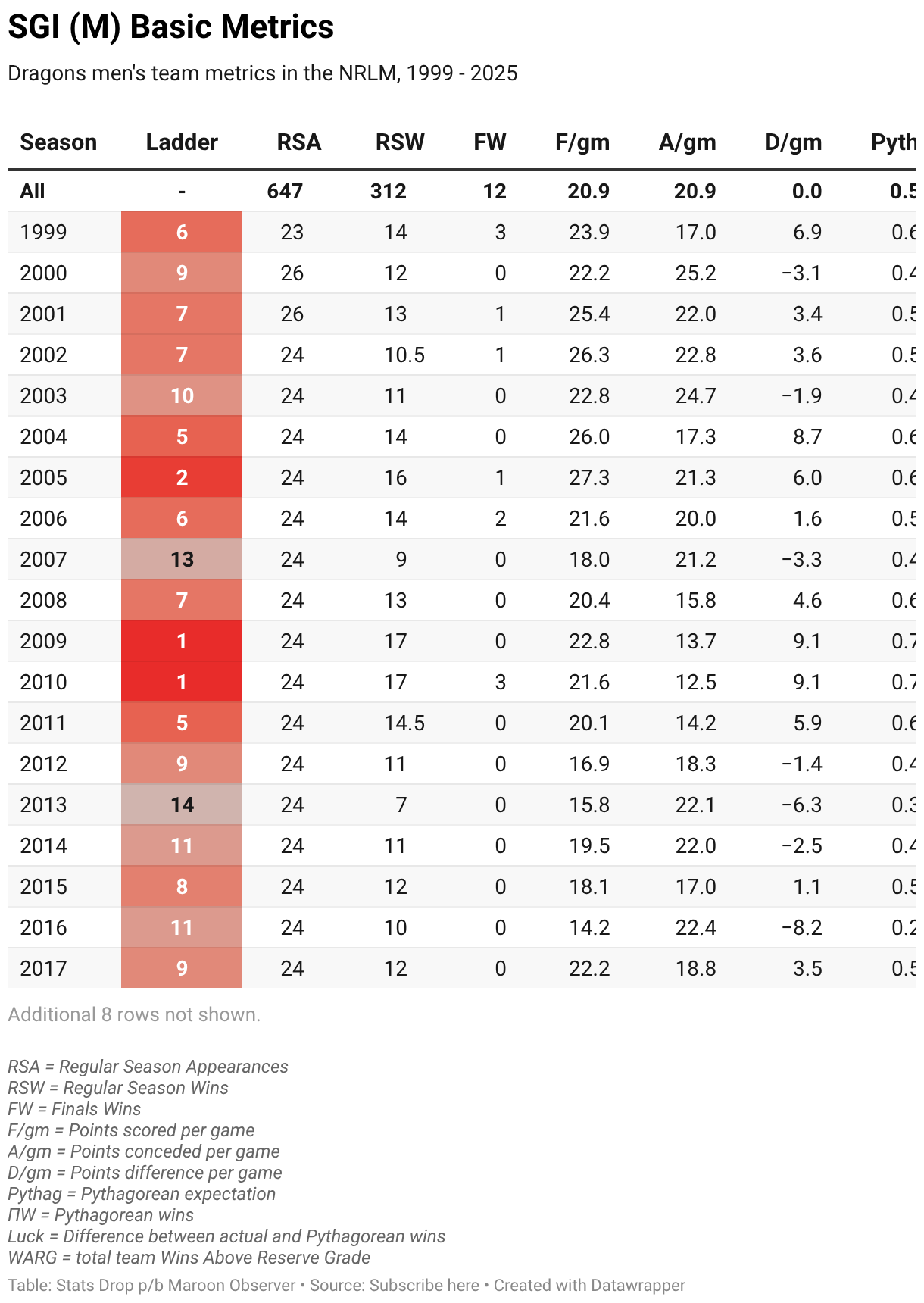 Dragons men's team metrics in the NRLM, 1999 - 2025