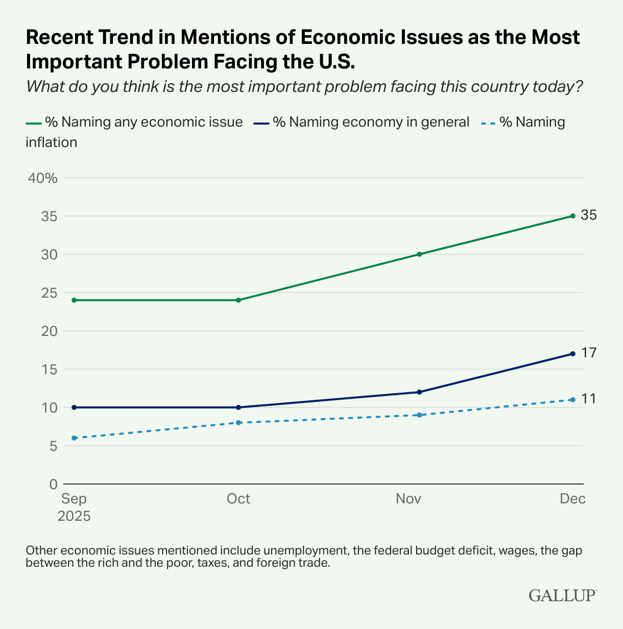 Line graph showing mentions of select economic issues as the most important problem facing the country between September 2025 and December 2025. Thirty-five percent name any economic issue as the most important problem, up from 24% in September. Seventeen percent name the economy in general terms, up from 10% in September. Eleven percent name inflation, up from 6% in September.