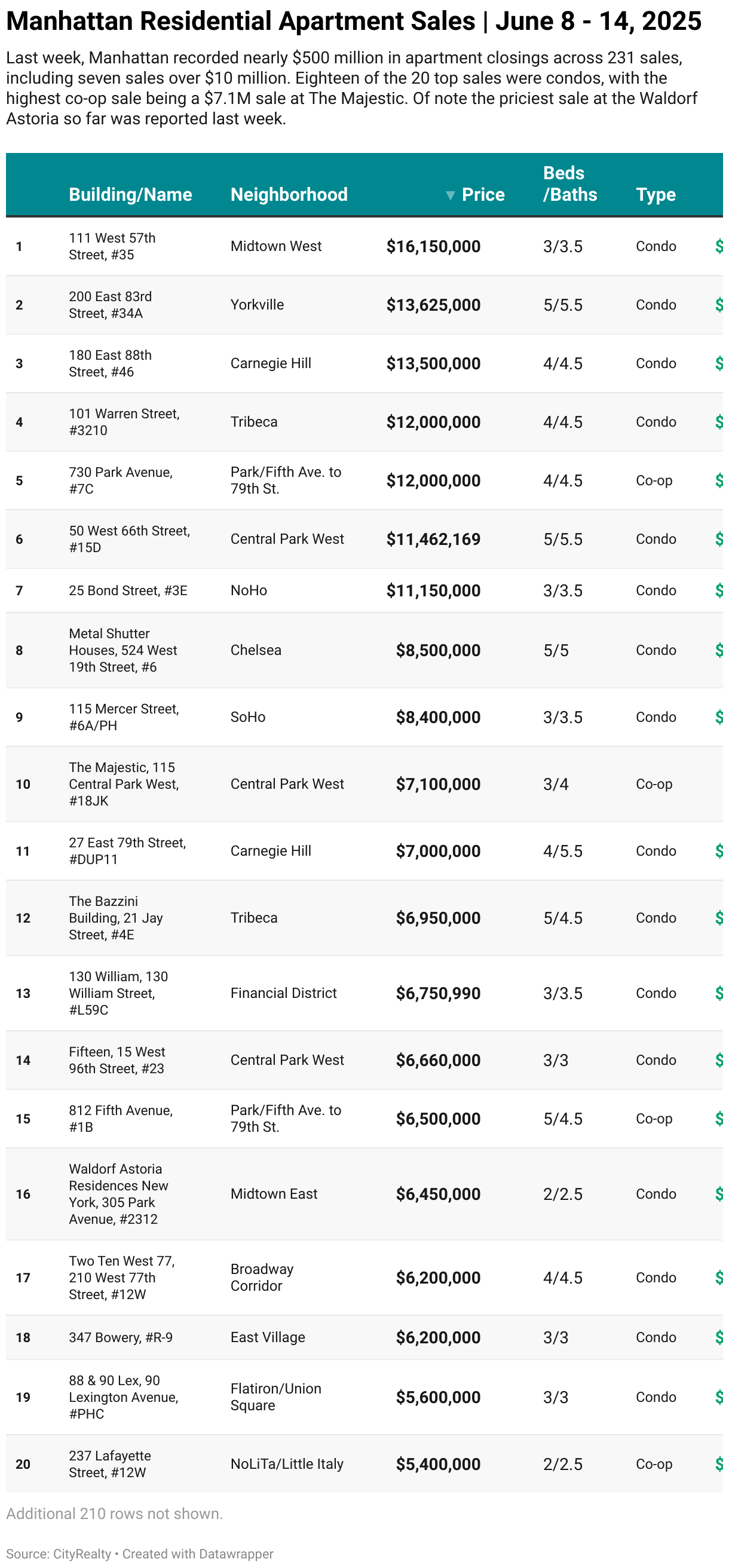 Last week, Manhattan recorded nearly $500 million in apartment closings across 231 sales, including seven sales over $10 million. Eighteen of the 20 top sales were condos, with the highest co-op sale being a $7.1M sale at The Majestic. Of note the priciest sale at the Waldorf Astoria so far was reported last week.