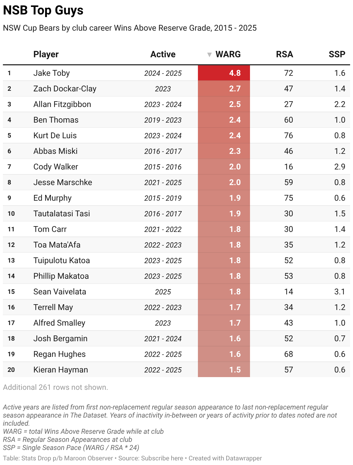 NSW Cup Bears by club career Wins Above Reserve Grade, 2015 - 2025