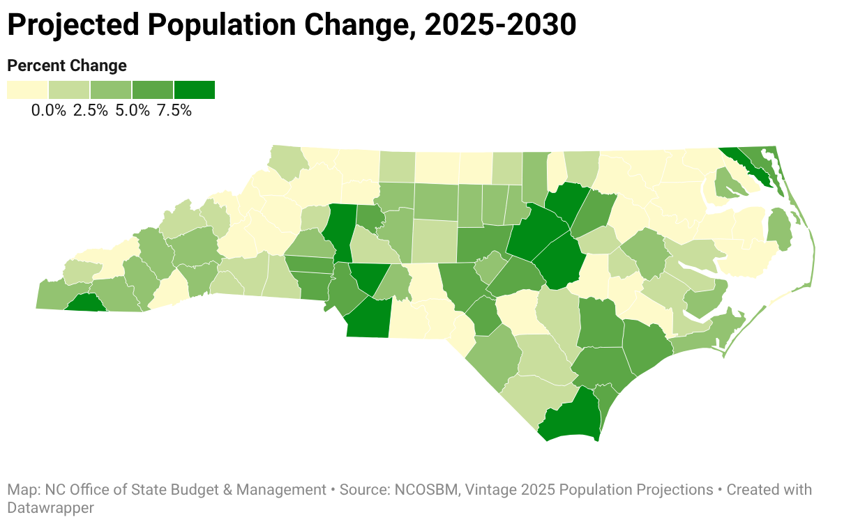 Map of North Carolina counties categorized according to rate of projected growth for 2025-2030.