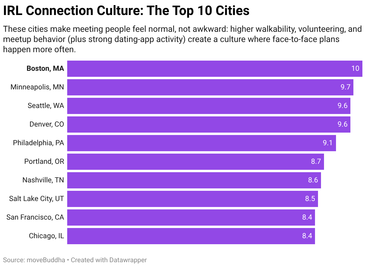 These cities make meeting people feel normal, not awkward: higher walkability, volunteering, and meetup behavior (plus strong dating-app activity) create a culture where face-to-face plans happen more often.