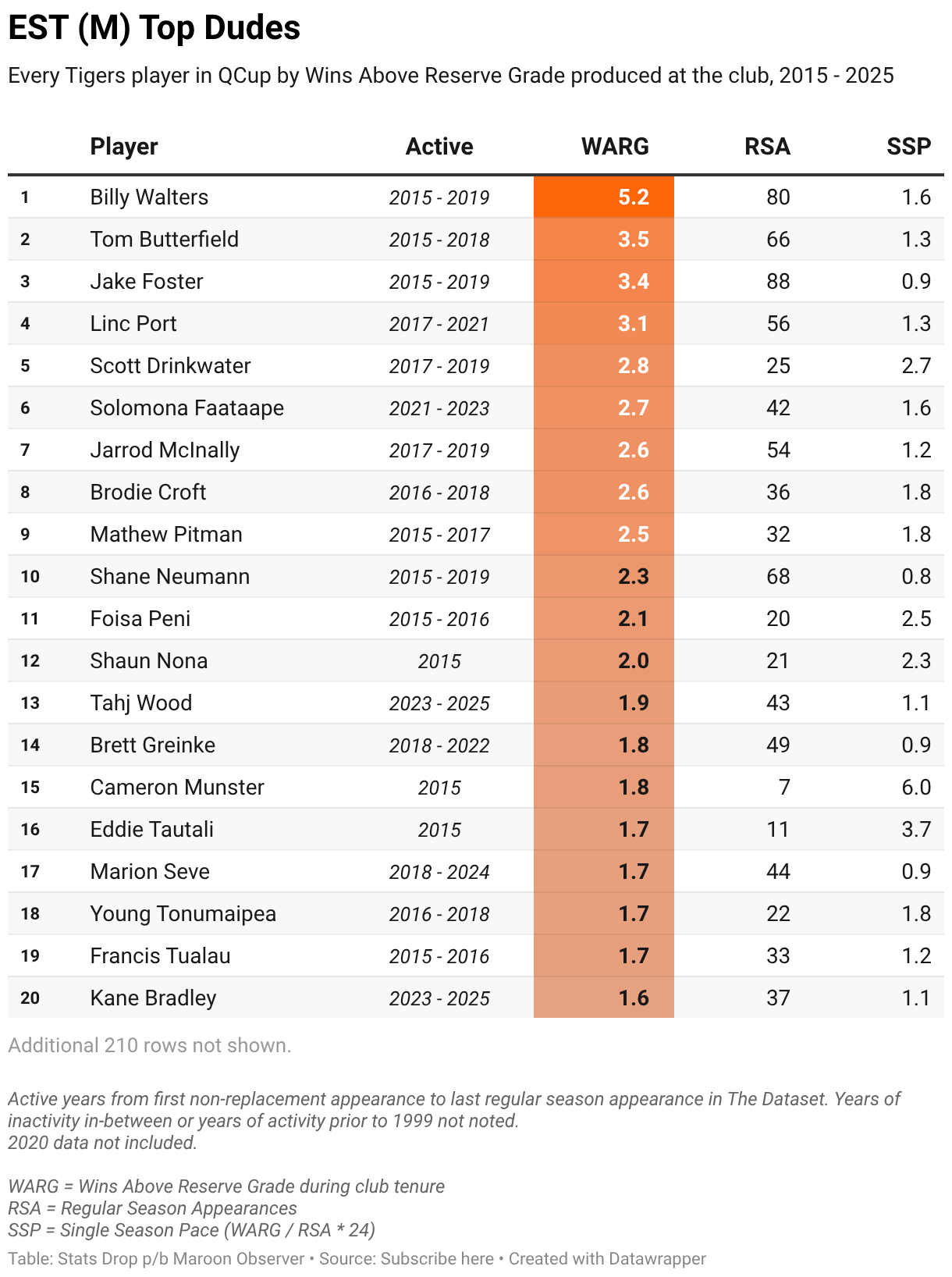 Every Tigers player in QCup by Wins Above Reserve Grade produced at the club, 2015 - 2025