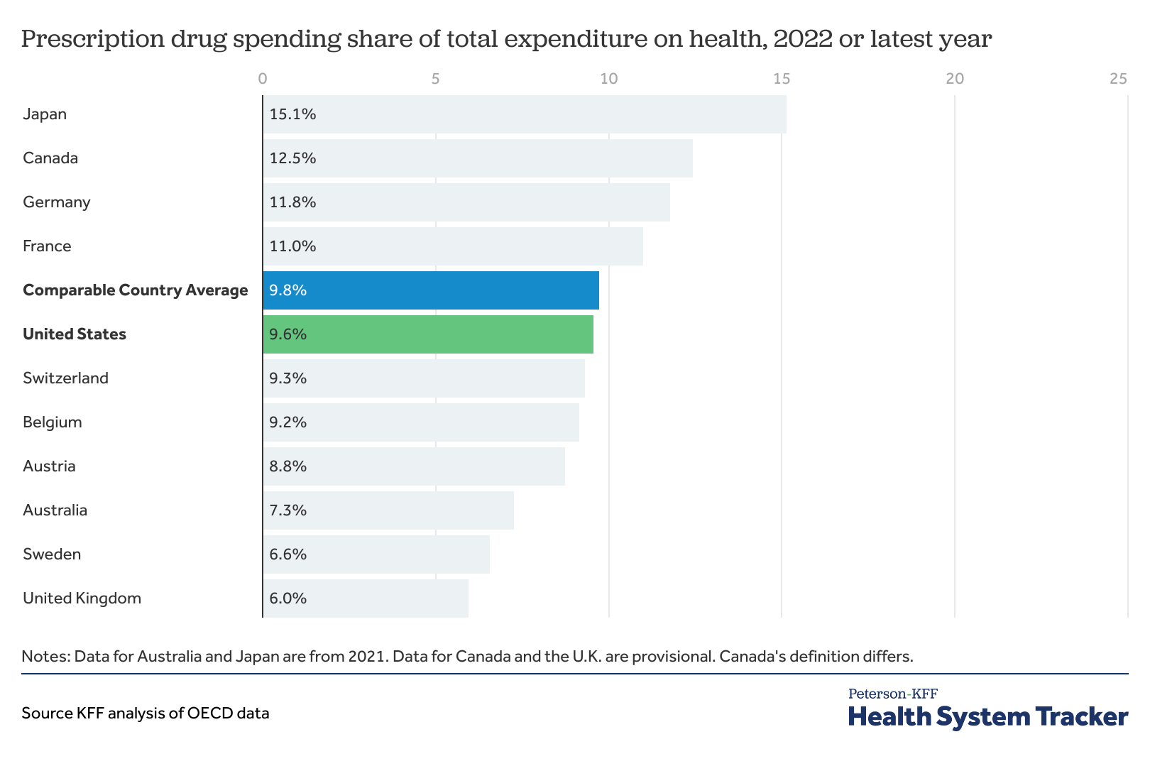 Prescription drug spending share of total expenditure on health, 2022 or latest year
