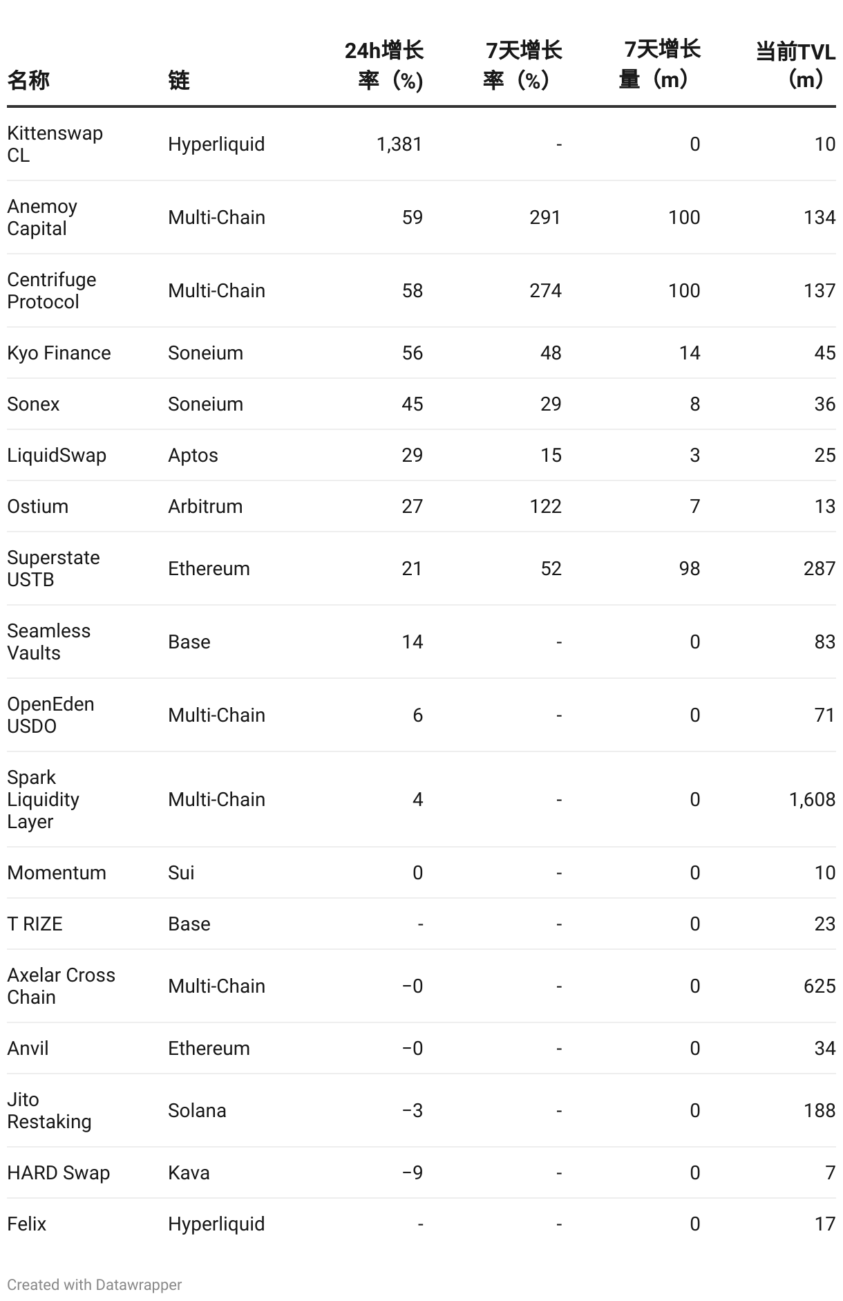 项目列表:TVL > 5m & (7天新增 | 24h TVL变化 > 10%)