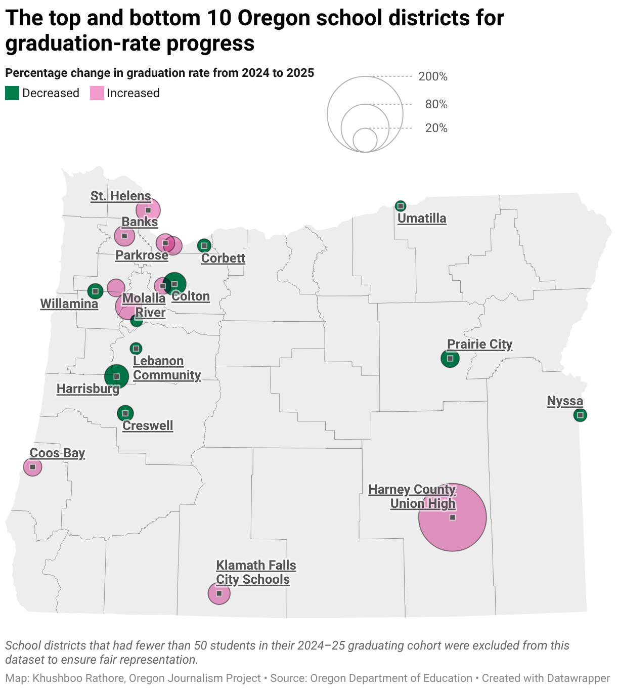 The top and bottom 10 Oregon school districts for graduation-rate progress