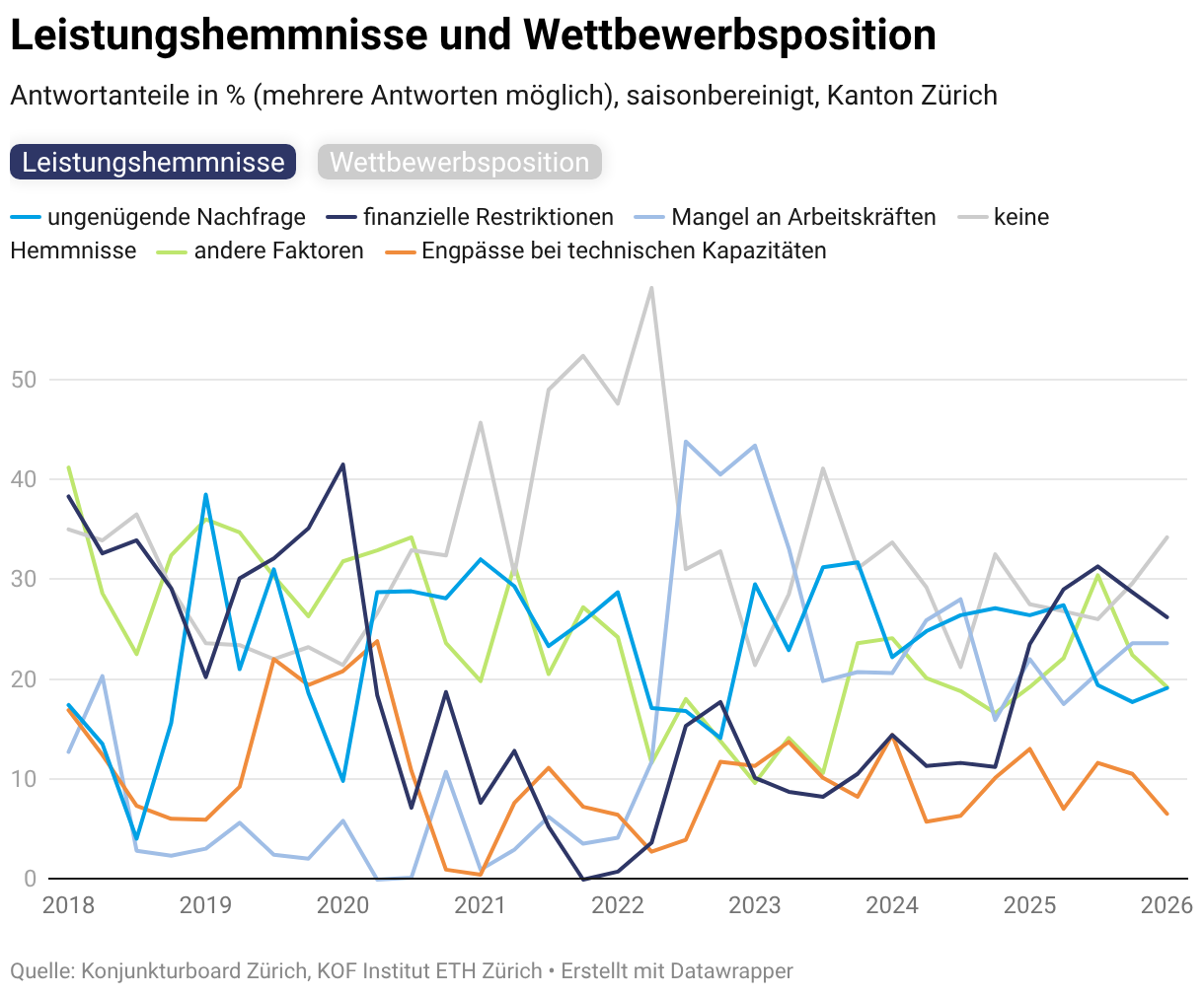 Antwortanteile in % (mehrere Antworten möglich), saisonbereinigt, Kanton Zürich Leistungshemmnisse Wettbewerbsposition