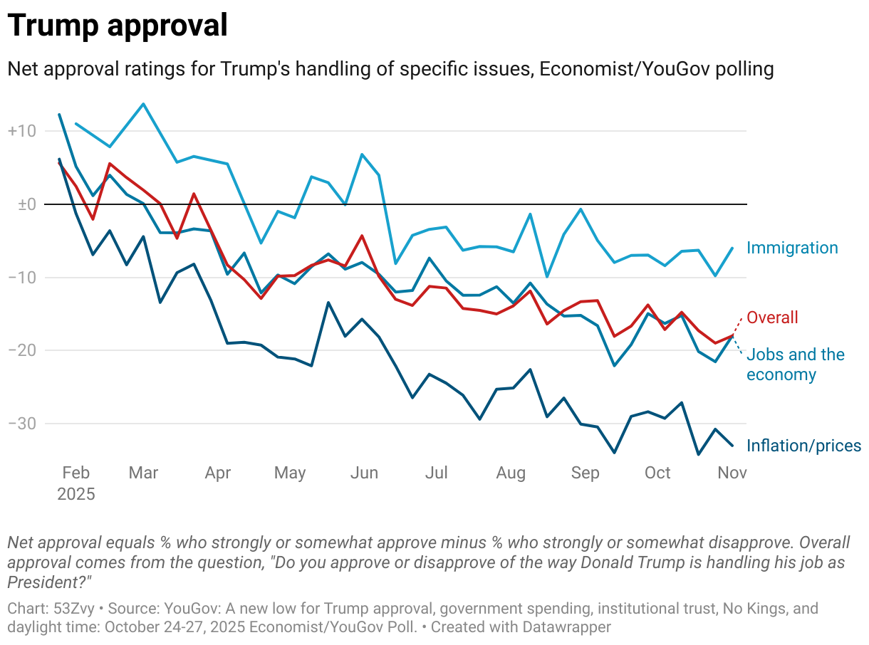 Net approval ratings for Trump's handling of specific issues, Economist/YouGov polling