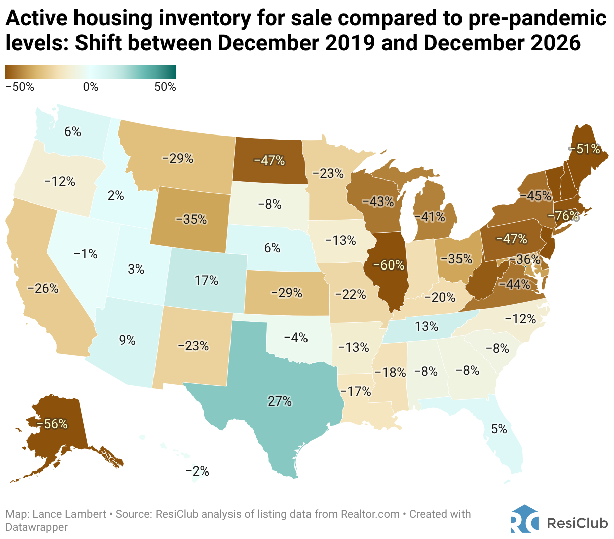 Active housing inventory for sale compared to pre-pandemic levels: Shift between December 2019 and December 2026