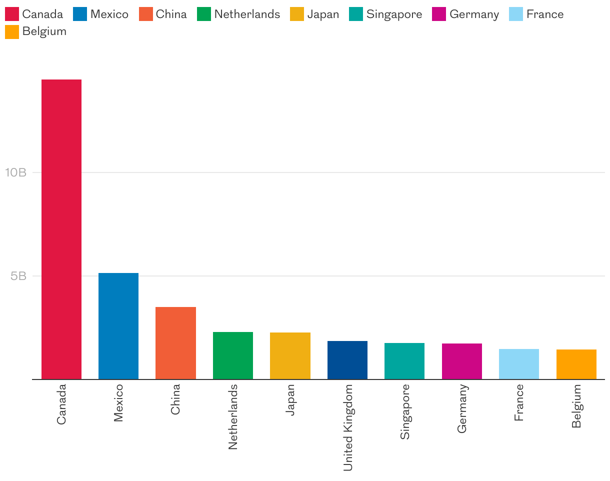 In 2024, 26% of the state exports were sent to Canada. That's almost three times the amount sent to Mexico — the second largest importer of Pennsylvania commodities.