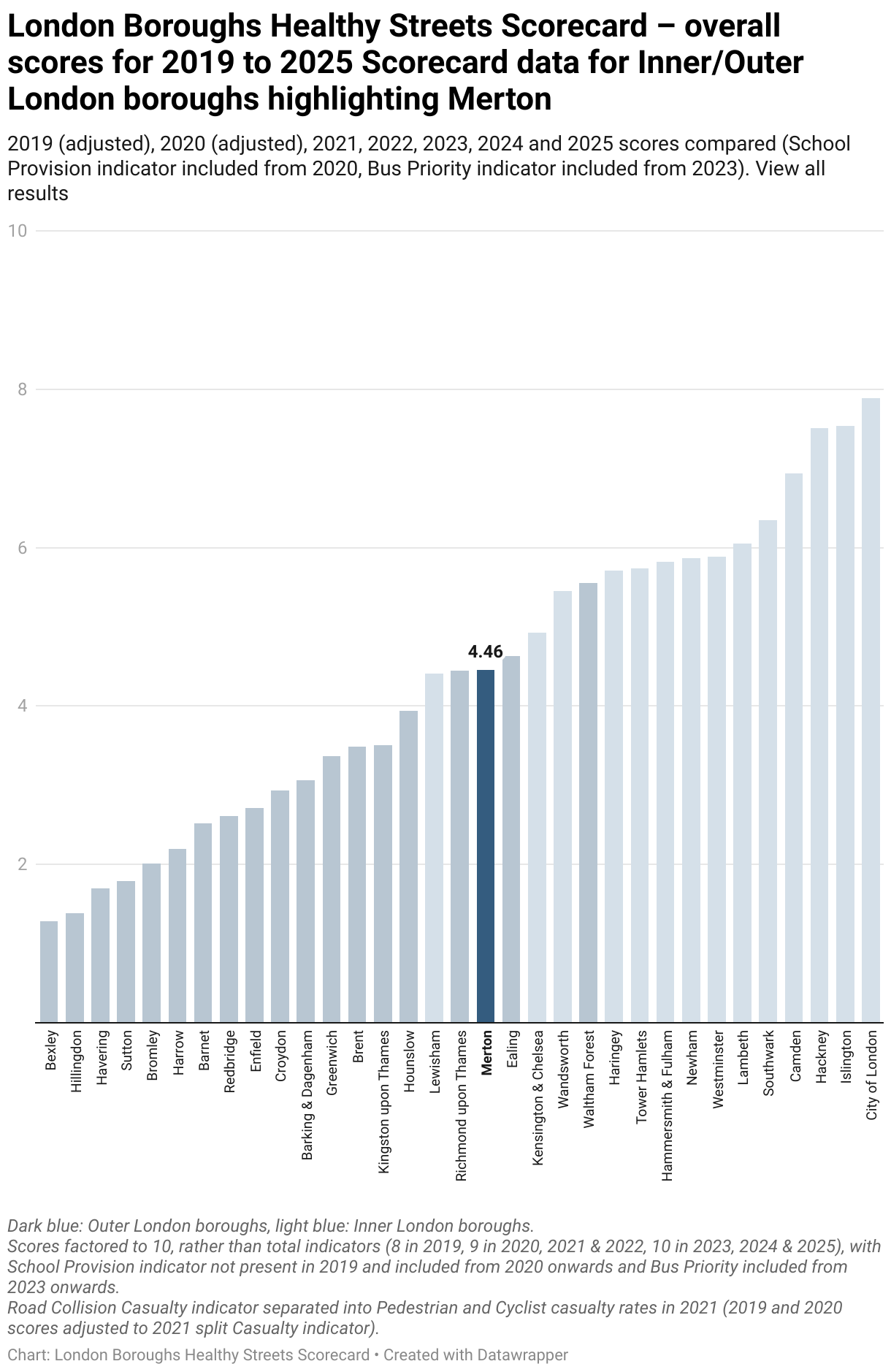 London Boroughs Healthy Streets Scorecard – overall scores for 2019 to 2025 Scorecard data for Inner/Outer London boroughs highlighting Merton