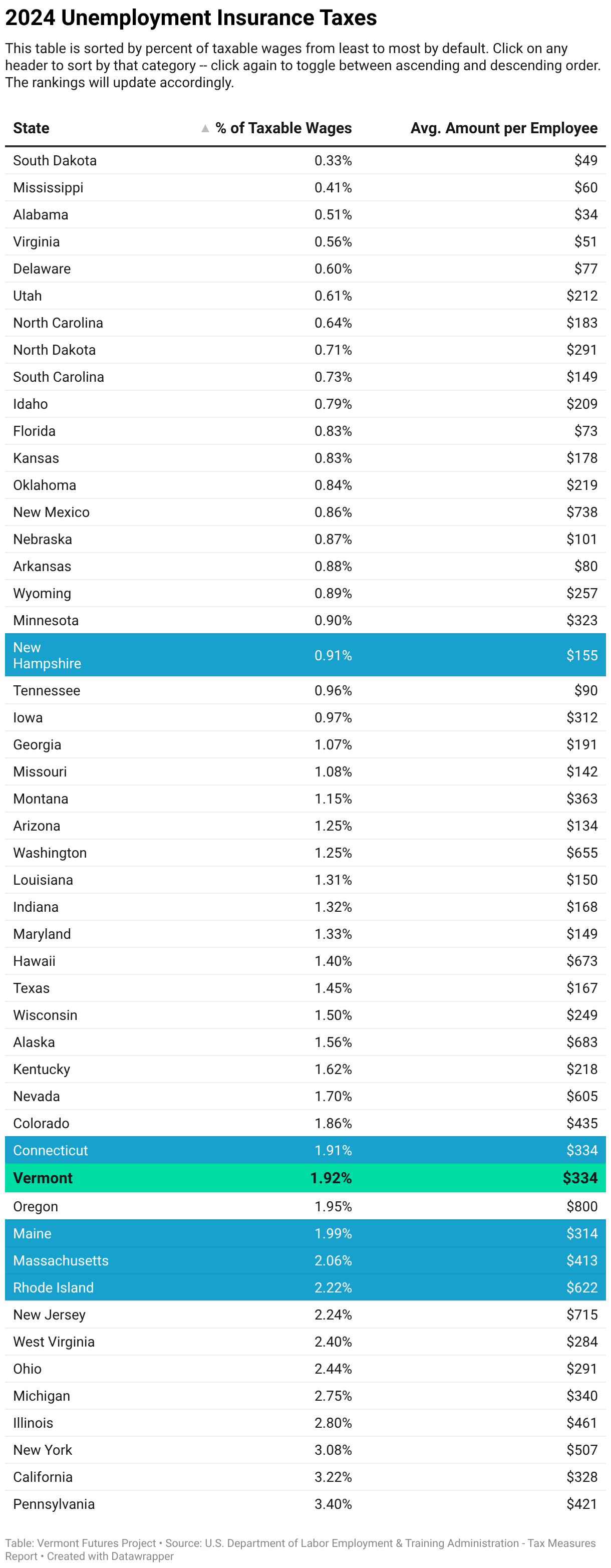This table is sorted by percent of taxable wages from least to most by default. Click on any header to sort by that category -- click again to toggle between ascending and descending order. The rankings will update accordingly.