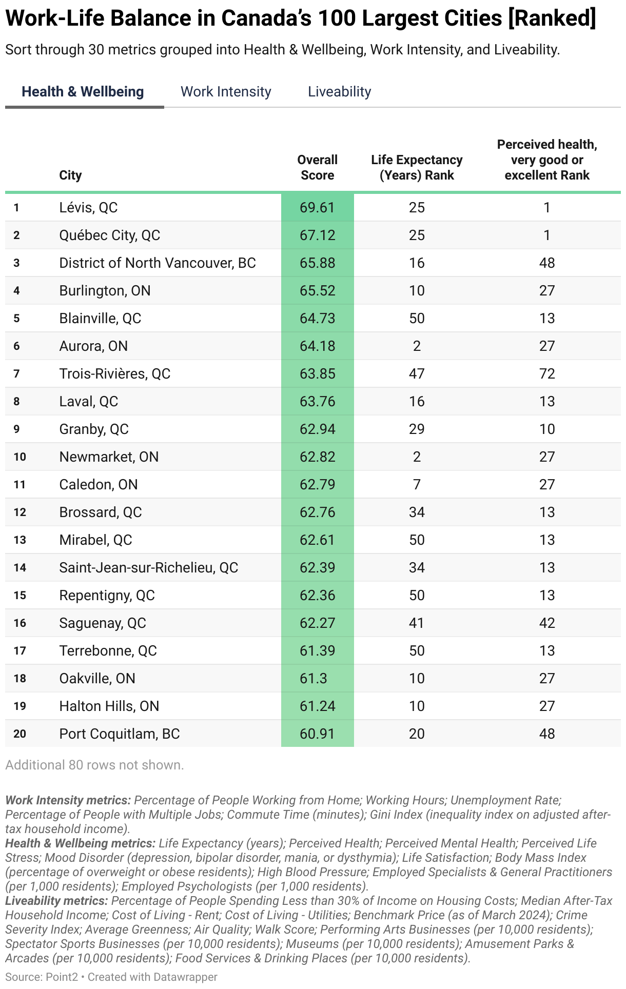 Sort through 30 metrics grouped into Health & Wellbeing, Work Intensity, and Liveability. Health & Wellbeing Work Intensity Liveability