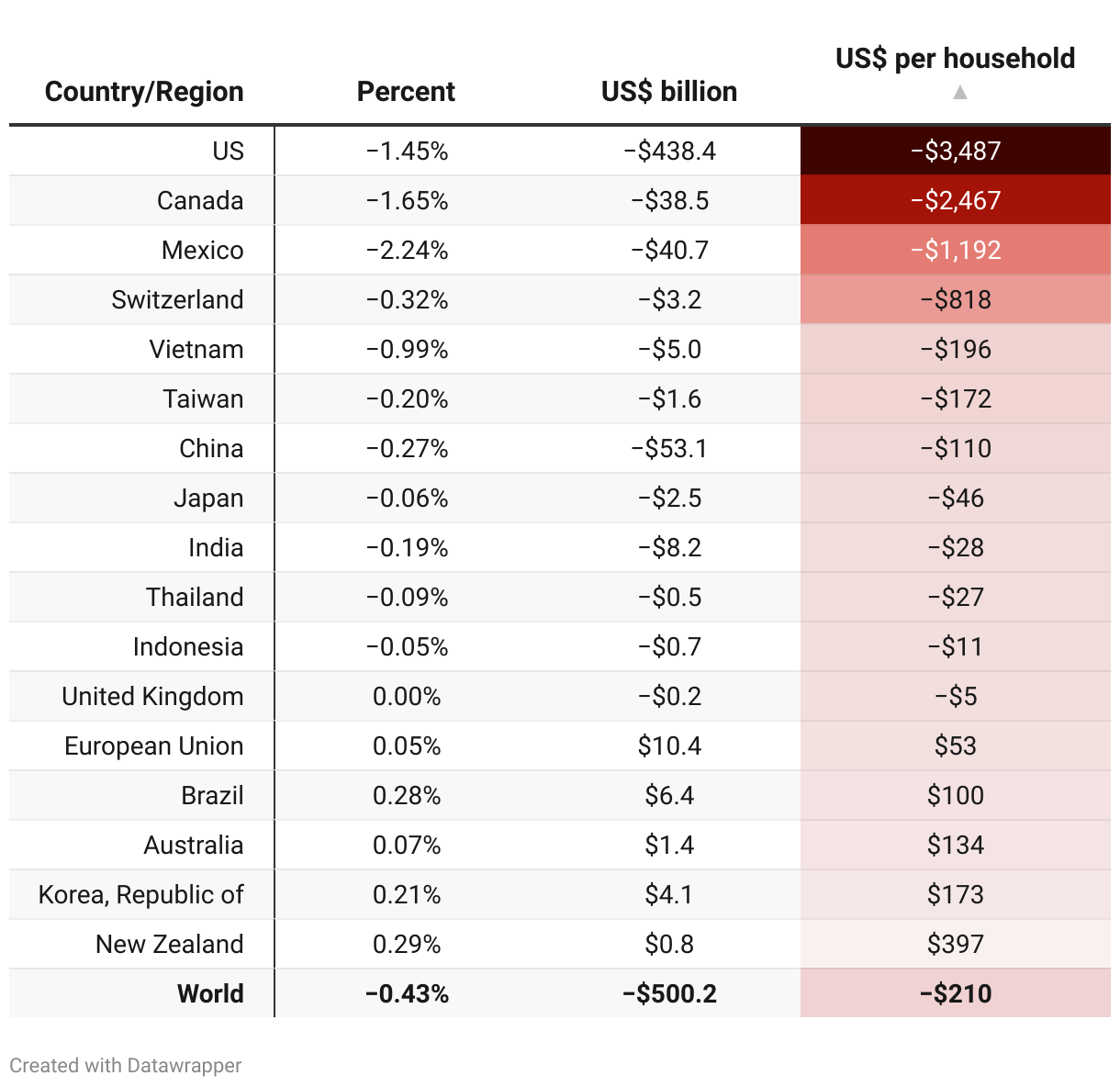 GDP changes due to new US tariffs with retaliation by other countries