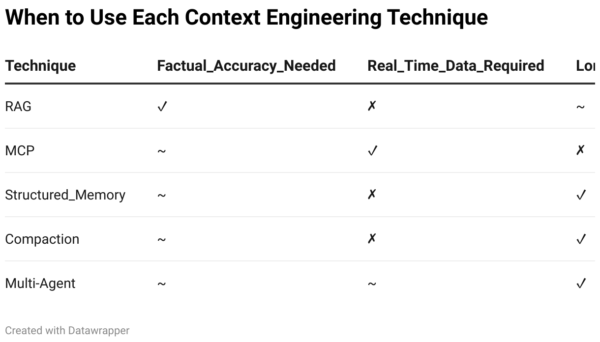 Table that provides rovides actionable guidance for choosing between RAG, MCP, Memory, and Compaction