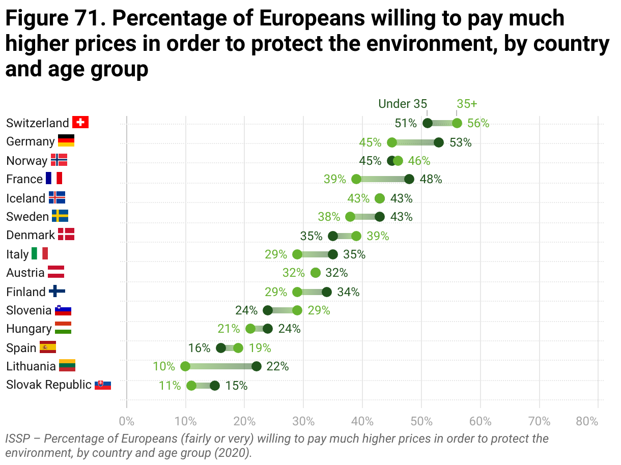 Figure 71. ISSP – Percentage of Europeans (fairly or very) willing to pay much higher prices in order to protect the environment, by country and age group (2020).