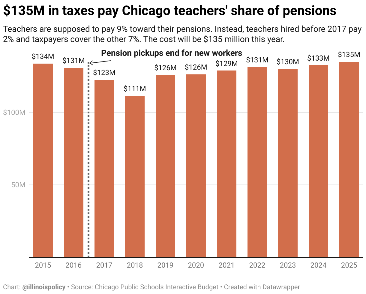 Teachers are supposed to pay 9% toward their pensions. Instead, teachers hired before 2017 pay 2% and taxpayers cover the other 7%. The cost will be $135 million this year.