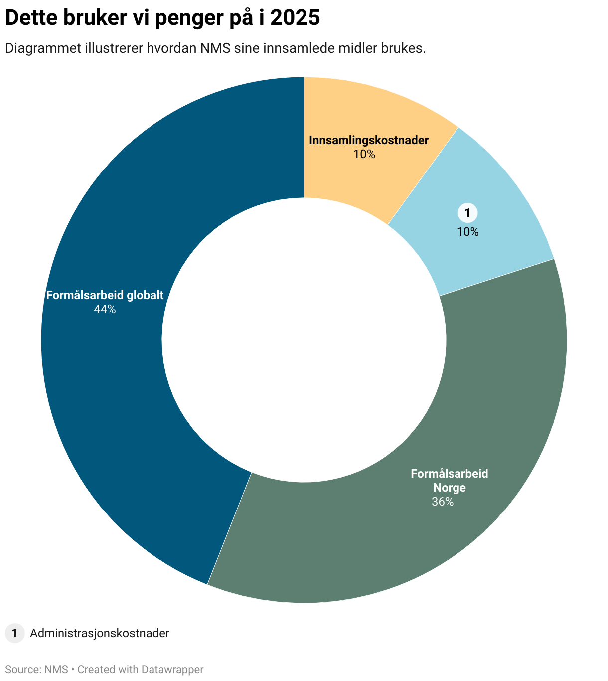 Diagrammet illustrerer hvordan NMS sine innsamlede midler brukes.