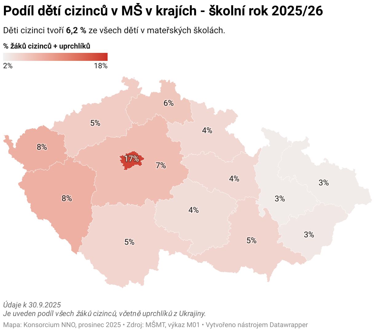 Děti cizinci tvoří 6,2 % ze všech dětí v mateřských školách.