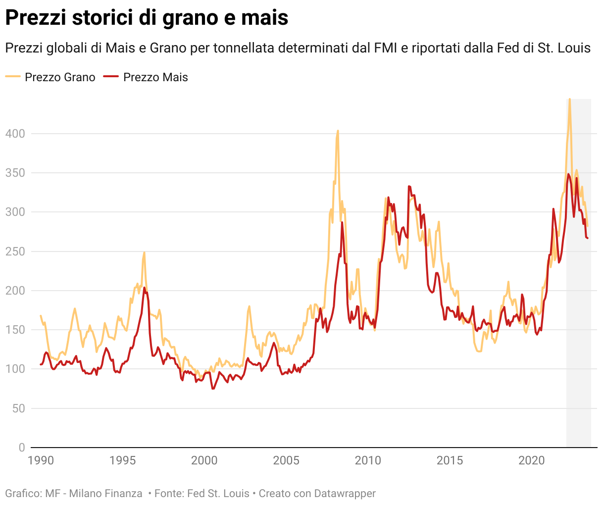 Prezzi globali di Mais e Grano per tonnellata determinati dal FMI e riportati dalla Fed di St. Louis