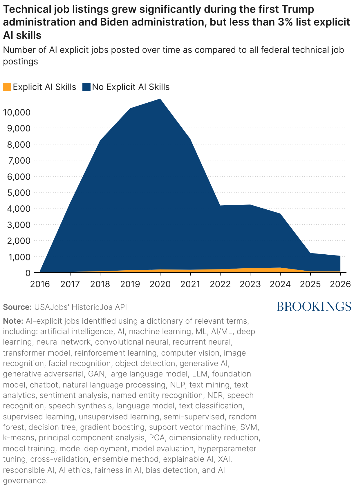 Number of AI explicit jobs posted over time as compared to all federal technical job postings