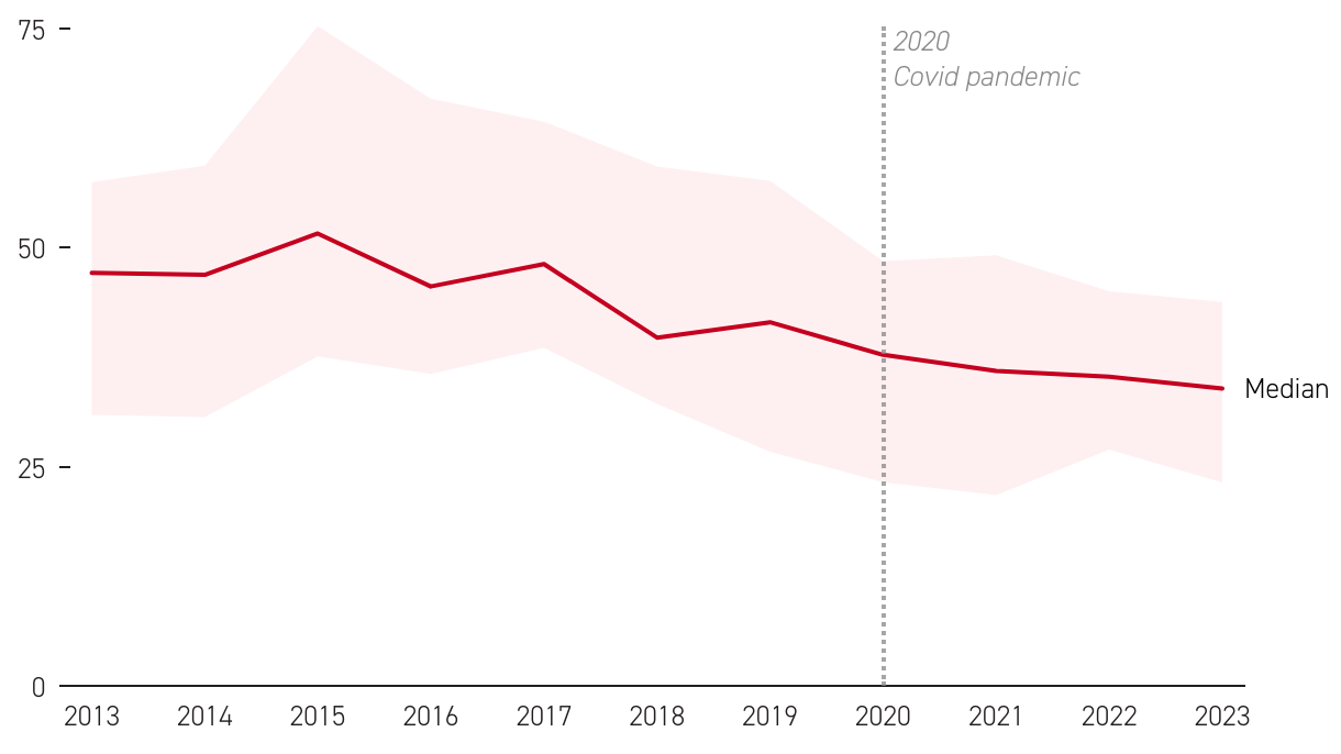 Annual concentration of nitrogen dioxide (NO2) — a key component of traffic-related air pollution — in the air in the metropolitan city of Milan, in micrograms per cubic meter. The area shaded in pink represents the range of annual average values reported by the 16 NO2 monitoring station in the metropolitan area.