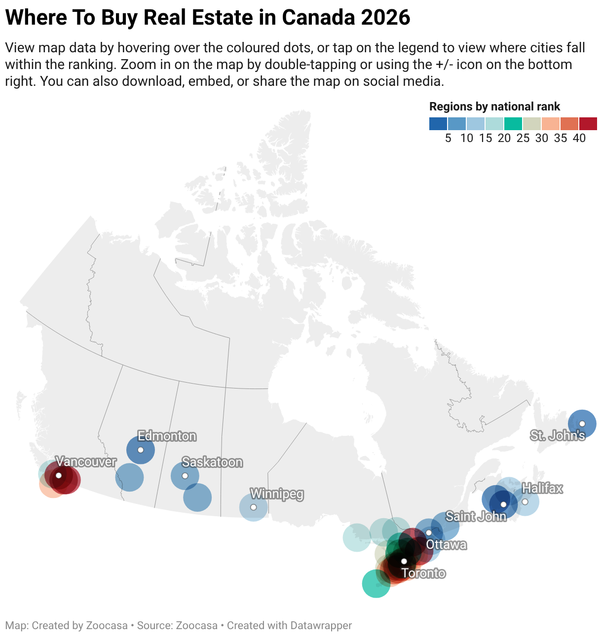 View map data by hovering over the coloured dots, or tap on the legend to view where cities fall within the ranking. Zoom in on the map by double-tapping or using the +/- icon on the bottom right. You can also download, embed, or share the map on social media.