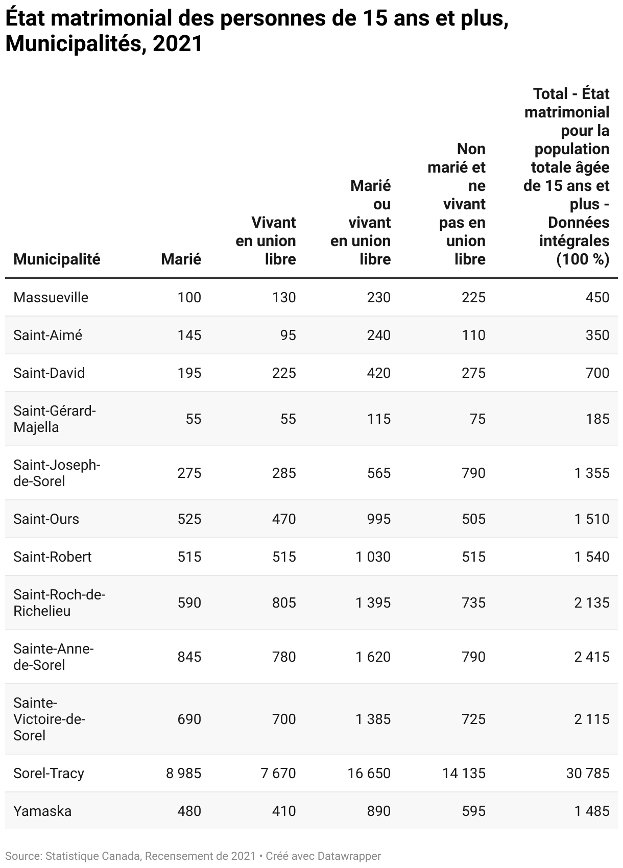État matrimonial des personnes de 15 ans et plus, Municipalités, 2021