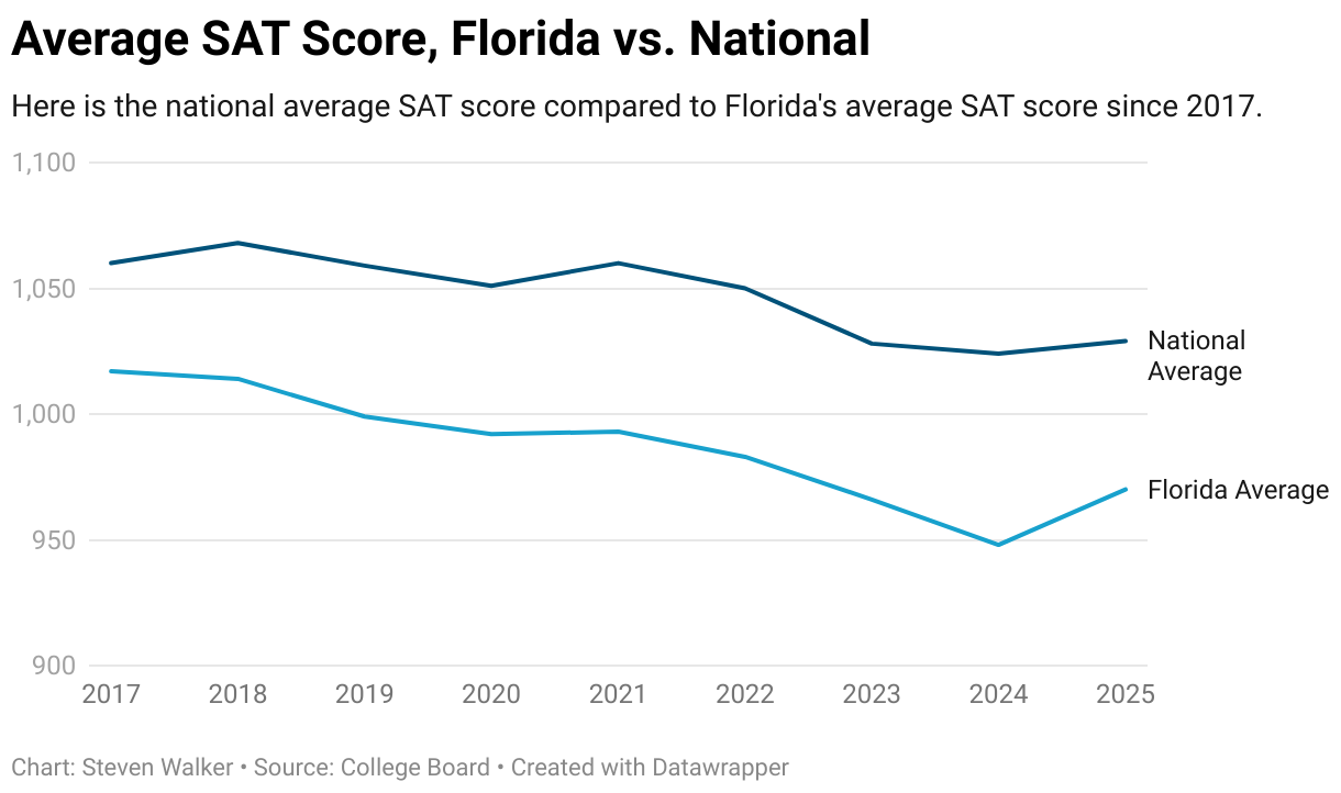 Here is the national average SAT score compared to Florida's average SAT score since 2017.