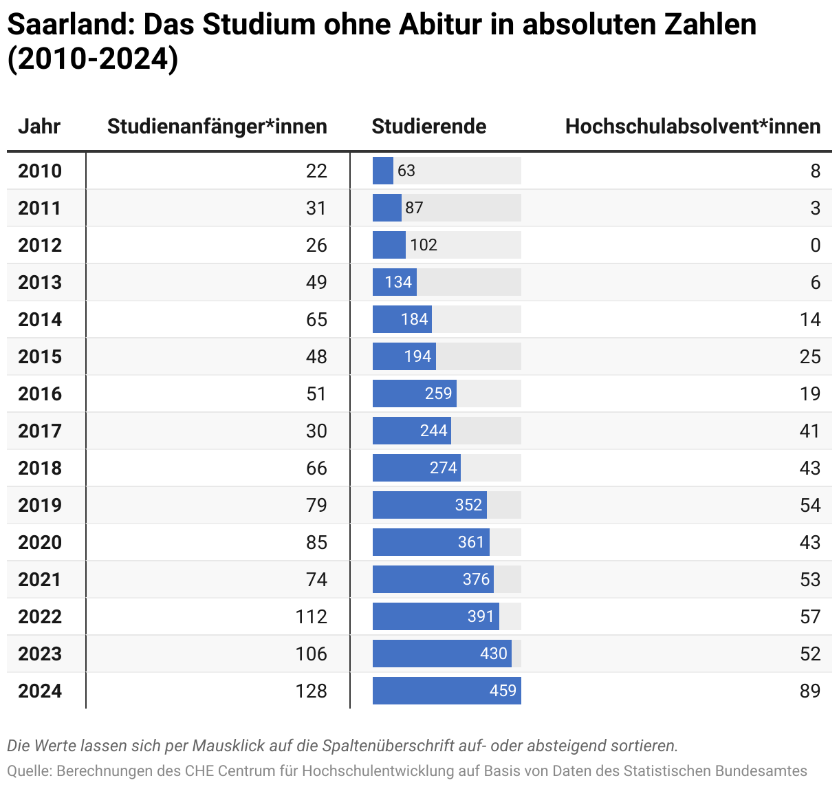 Saarland: Das Studium ohne Abitur in absoluten Zahlen (2010-2024)