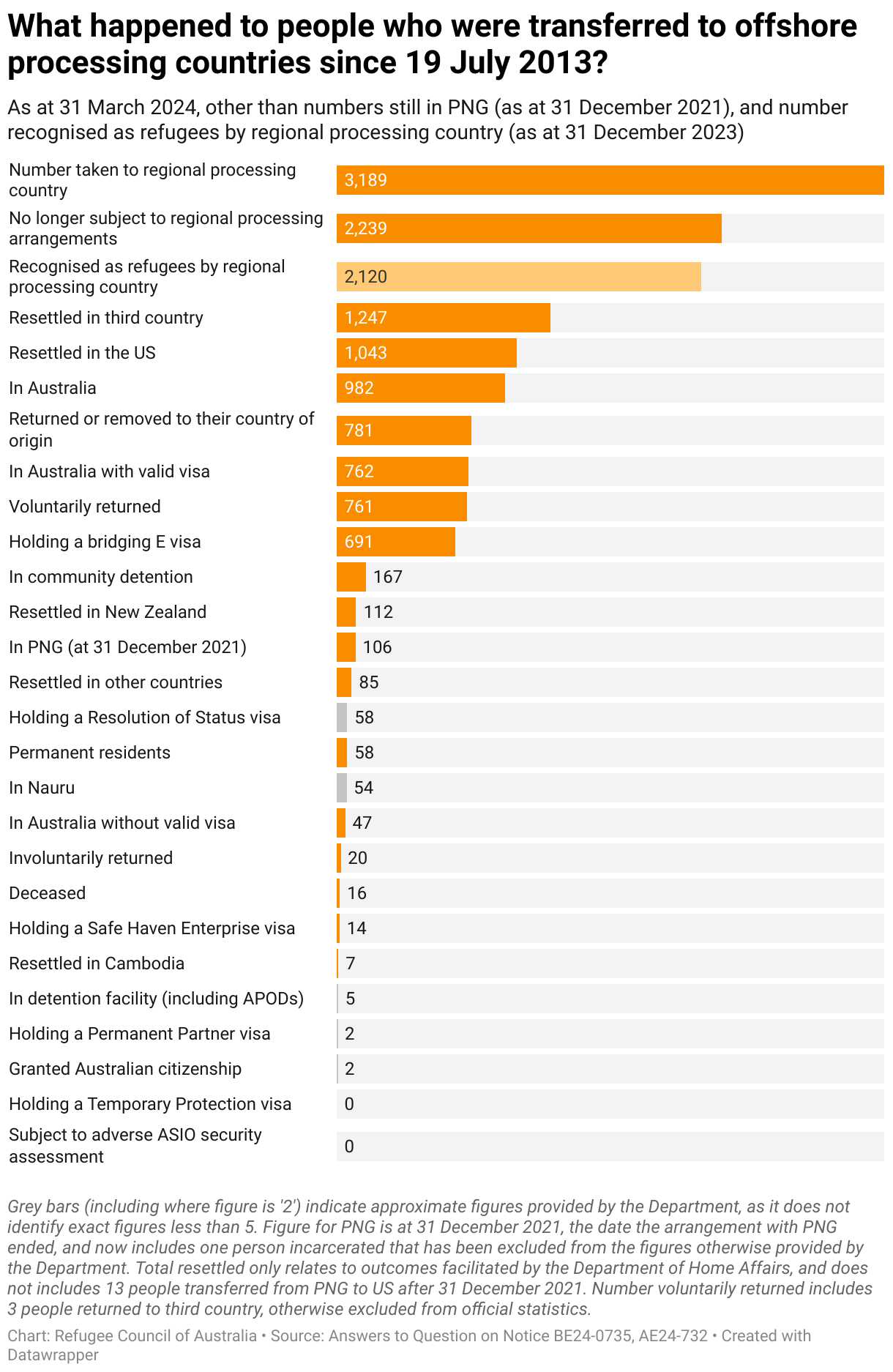 As at 31 March 2024, other than numbers still in PNG (as at 31 December 2021), and number recognised as refugees by regional processing country (as at 31 December 2023)