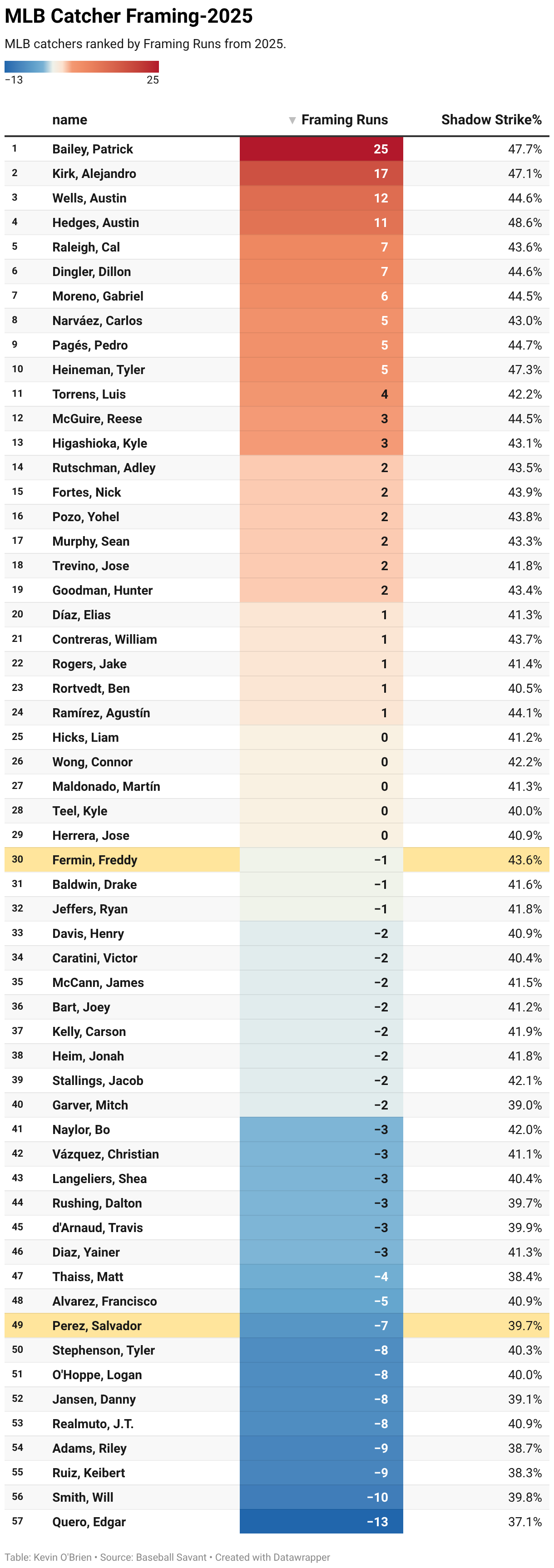 MLB catchers ranked by Framing Runs from 2025.