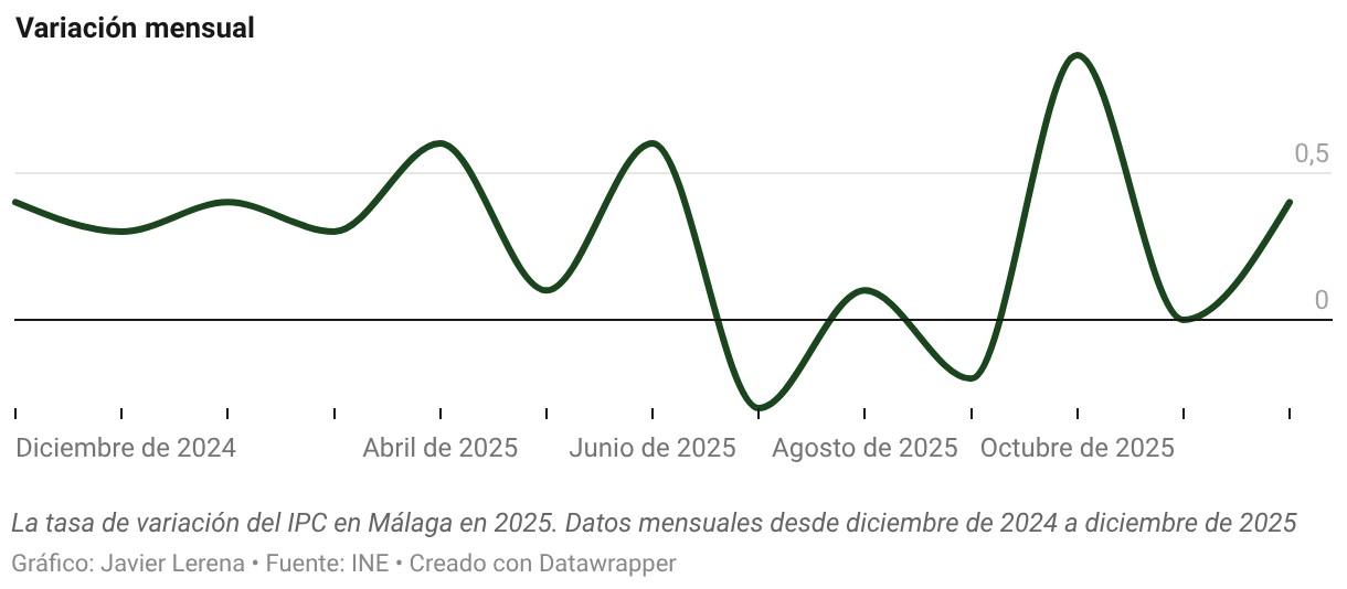 La tasa de variación del IPC en Málaga en 2025. Datos mensuales desde diciembre de 2024 a diciembre de 2025