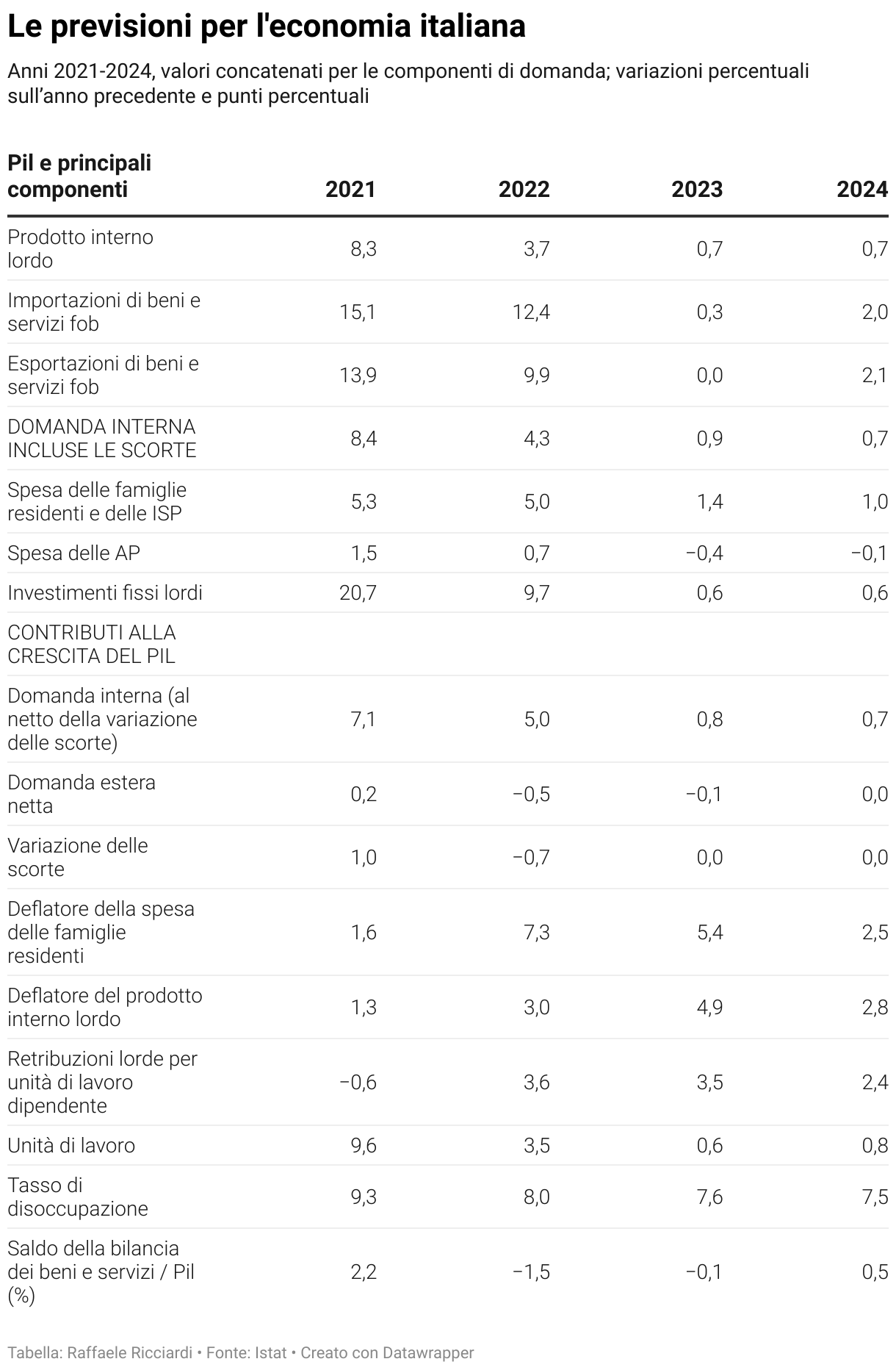 Anni 2021-2024, valori concatenati per le componenti di domanda; variazioni percentuali sull’anno precedente e punti percentuali