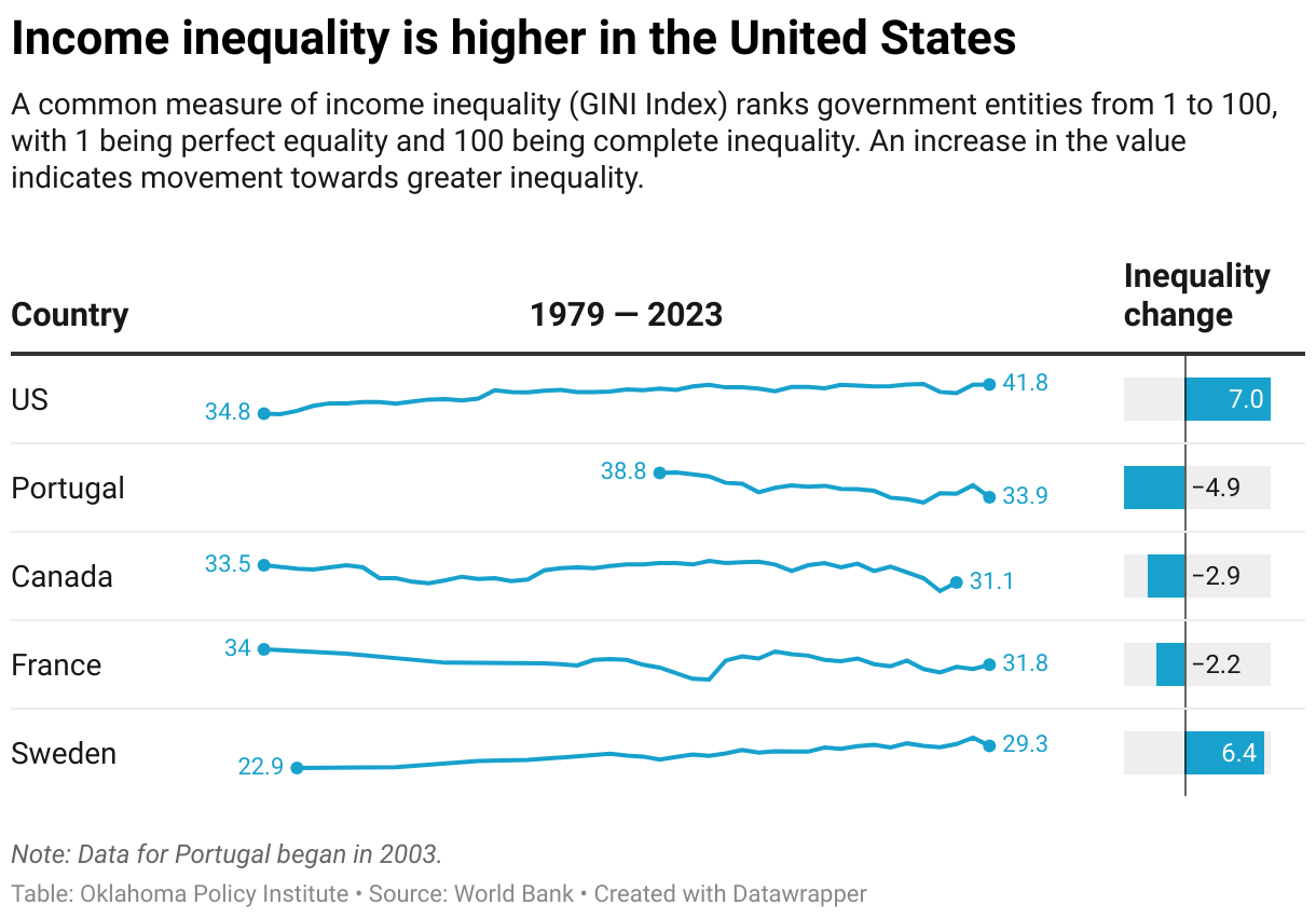 A common measure of income inequality (GINI Index) ranks government entities from 1 to 100, with 1 being perfect equality and 100 being complete inequality. An increase in the value indicates movement towards greater inequality.