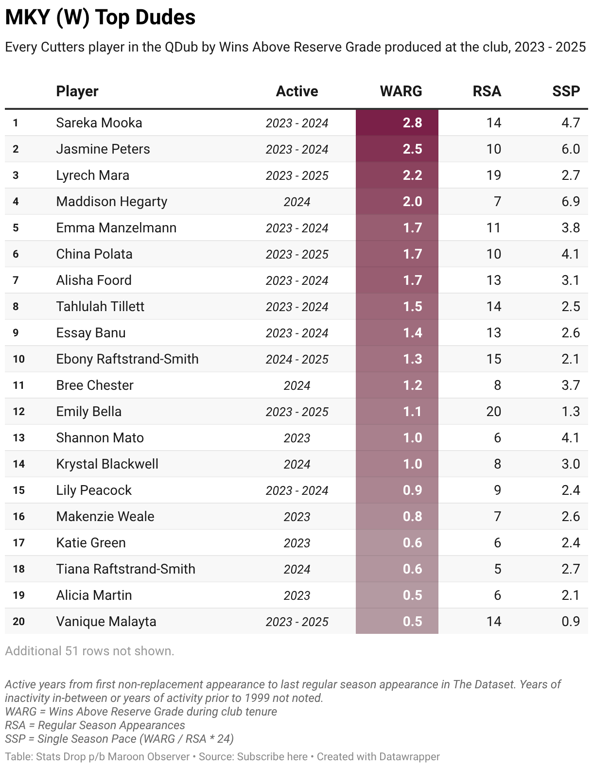 Every Cutters player in the QDub by Wins Above Reserve Grade produced at the club, 2023 - 2025